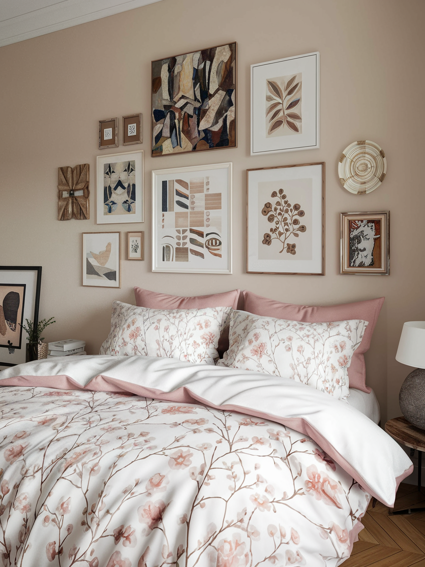 Creating a wall art gallery is a stylish way to personalize your bedroom while adding visual interest and character. Instead of relying on a single large piece, arrange a collection of framed prints, photographs, or artwork that reflects your personality and aesthetic. Keeping a consistent color palette or frame style helps maintain a cohesive look even when mixing different images. A gallery wall works beautifully above the bed, dresser, or along an empty side wall to fill the space without overwhelming it. This trend allows you to showcase meaningful pieces while adding depth and dimension to the room. Over time, the collection can evolve as you update or rotate artwork, making the bedroom feel dynamic, expressive, and uniquely yours.