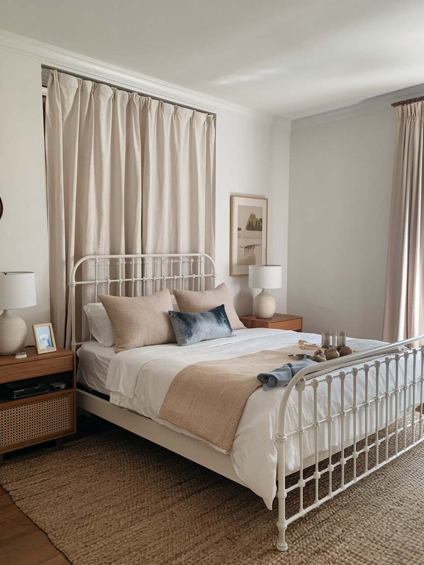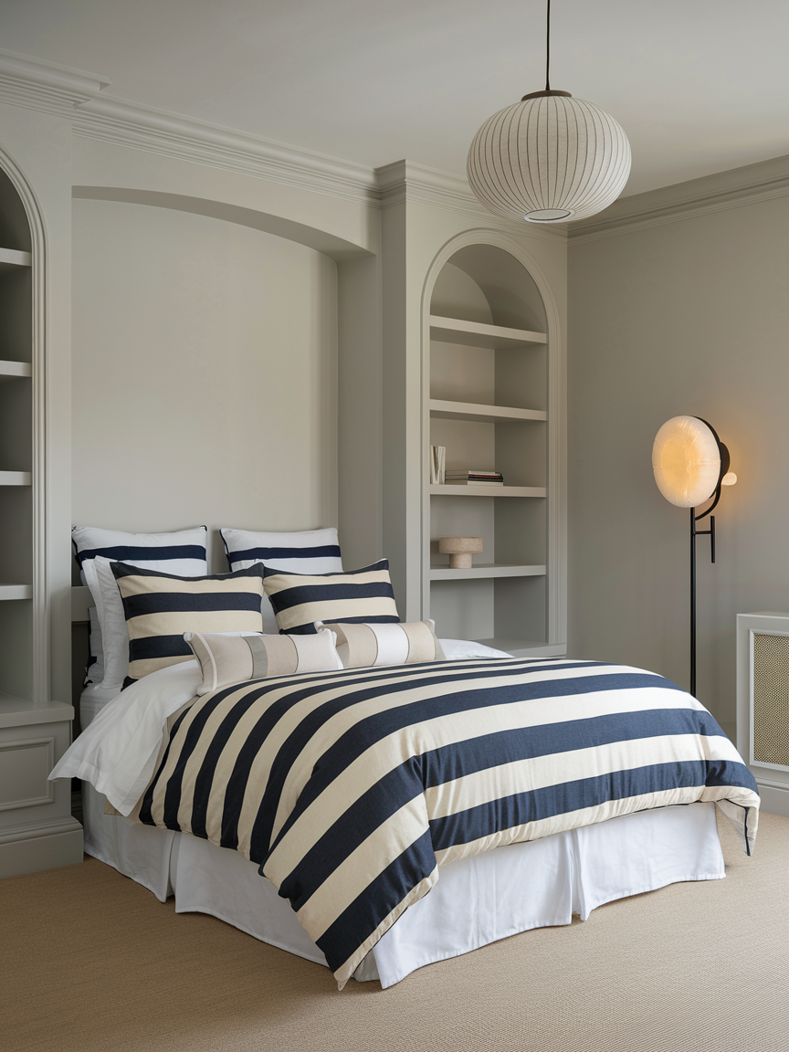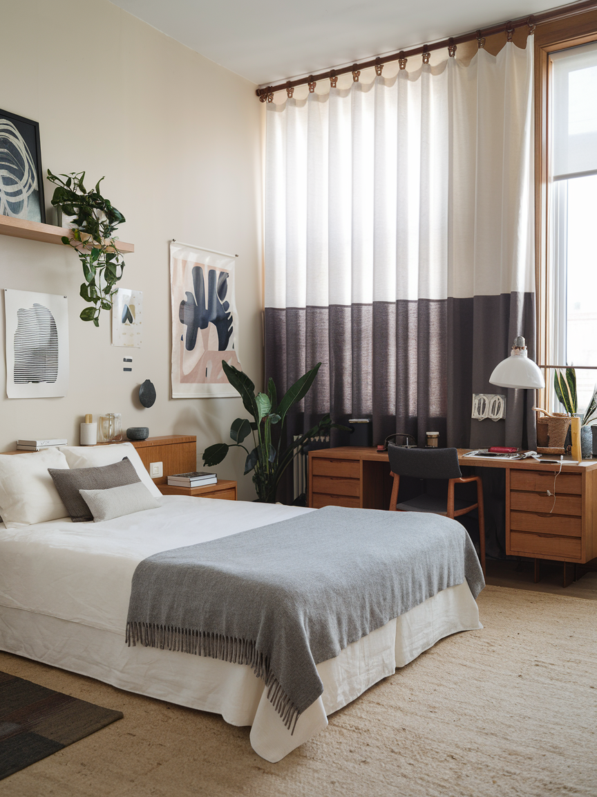 Layering drapery adds softness and elegance while improving light control and privacy. Combining sheer curtains with heavier blackout panels allows flexibility throughout the day and night. Soft fabrics in neutral or muted tones enhance the cozy atmosphere and frame windows beautifully. Floor-length curtains also create the illusion of higher ceilings, making the room feel more spacious. This trend combines practicality with style, helping your bedroom feel more polished, comfortable, and visually balanced.