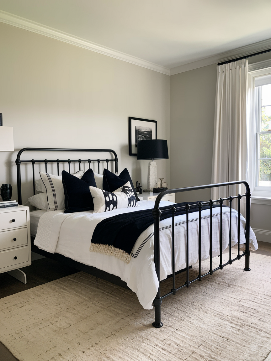Incorporating black accents is a modern trend that adds contrast and sophistication to a bedroom. Elements such as black light fixtures, picture frames, drawer handles, or metal bed frames create visual definition without dominating the space. When paired with light or neutral tones, black details help anchor the design and add a contemporary edge. The key is to use these accents sparingly so they enhance rather than overwhelm the overall aesthetic. This approach works beautifully in modern, minimalist, and industrial-inspired bedrooms. Black accents provide a timeless, polished look that elevates the room while maintaining balance and simplicity.