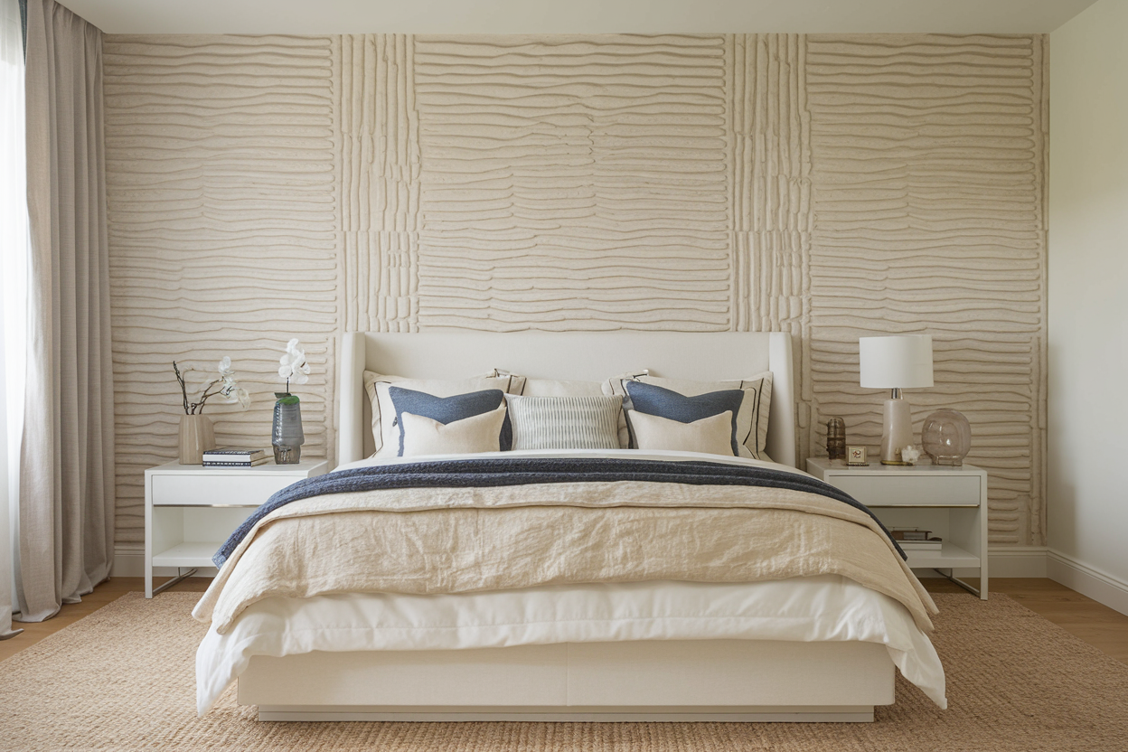 Instead of bold colors, textured accent walls are becoming a popular way to add depth and interest. Options like wood paneling, limewash paint, fabric panels, or subtle wallpaper create a sophisticated focal point without overwhelming the room. Textured walls work especially well behind the bed, helping to define the sleeping area and add architectural character. Neutral tones keep the look modern and versatile while allowing other decor elements to shine. This trend adds dimension and personality while maintaining a calm, elegant atmosphere that suits both contemporary and transitional bedroom styles.