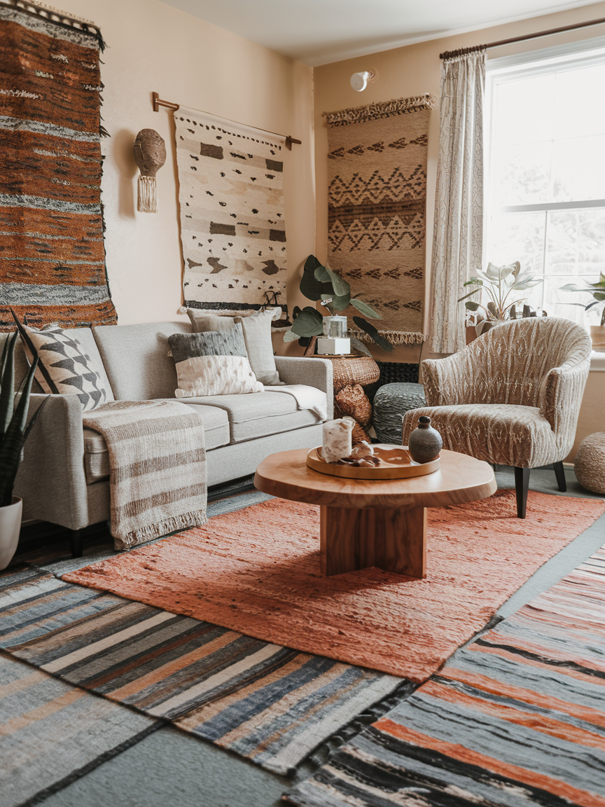 One rug is fine, but two or three? That is where the Bohemian magic happens. Layering rugs is like stacking cozy blankets under your feet. Try mixing different sizes, colors, and textures for a look that feels collected over time. You could put a big neutral base rug and then add a smaller patterned one on top to create depth. This trick not only looks great but also makes the room feel instantly warmer and softer. Plus, it is a fantastic way to hide less-than-perfect flooring without committing to a total renovation.