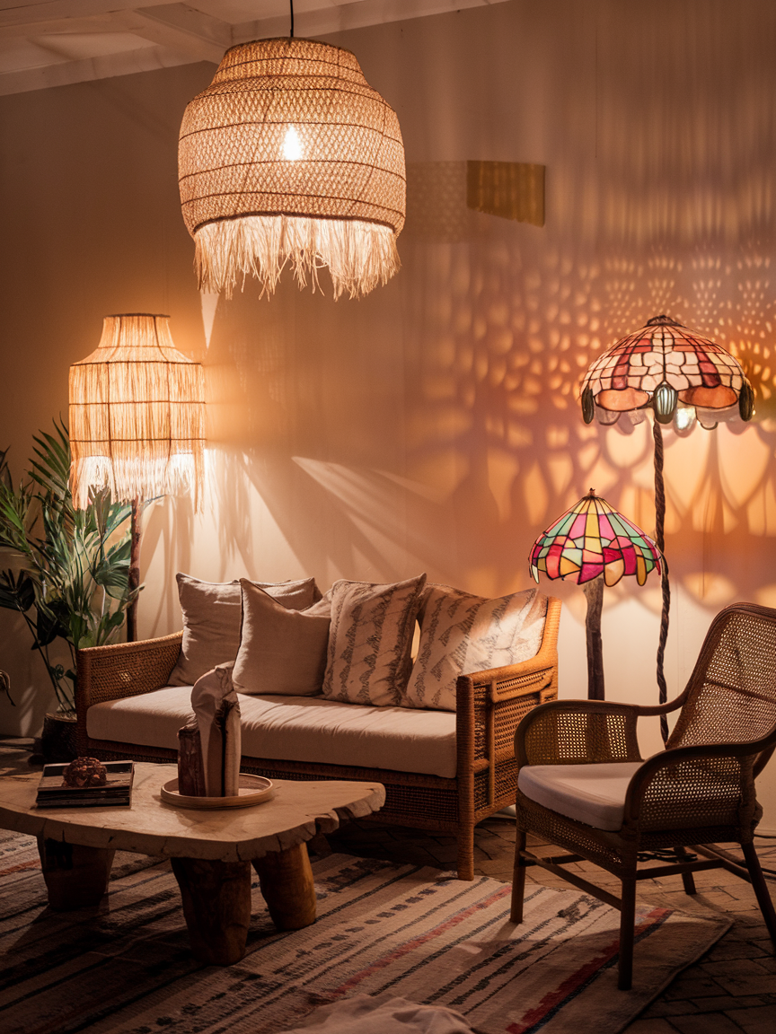 Lighting in a Bohemian living room is not just about function, it is about creating a mood. Instead of a standard overhead light, bring in a couple of floor lamps with unique bases or shades. Think carved wood, woven rattan, or colorful stained glass. These add character while casting a warm, soft glow that makes the room feel cozy and relaxed. Plus, the flexibility of movable lighting means you can easily change up your space without drilling new holes in the ceiling.