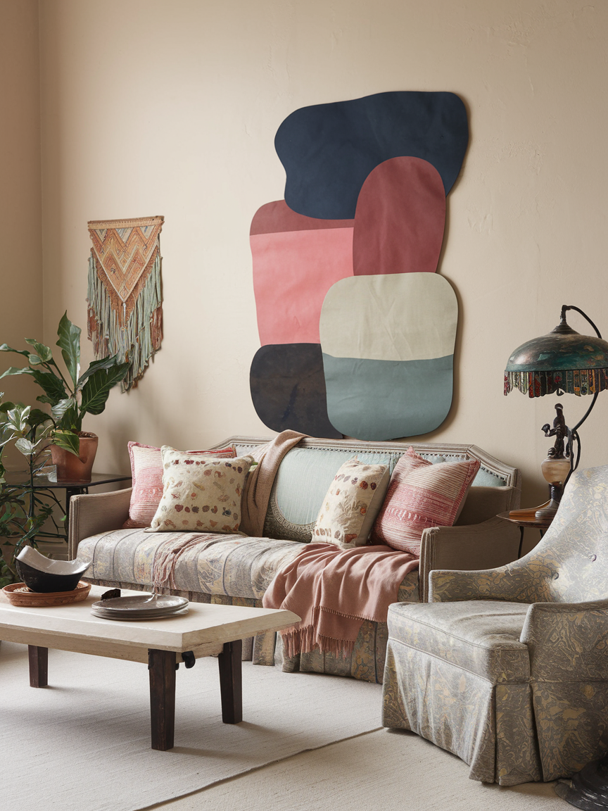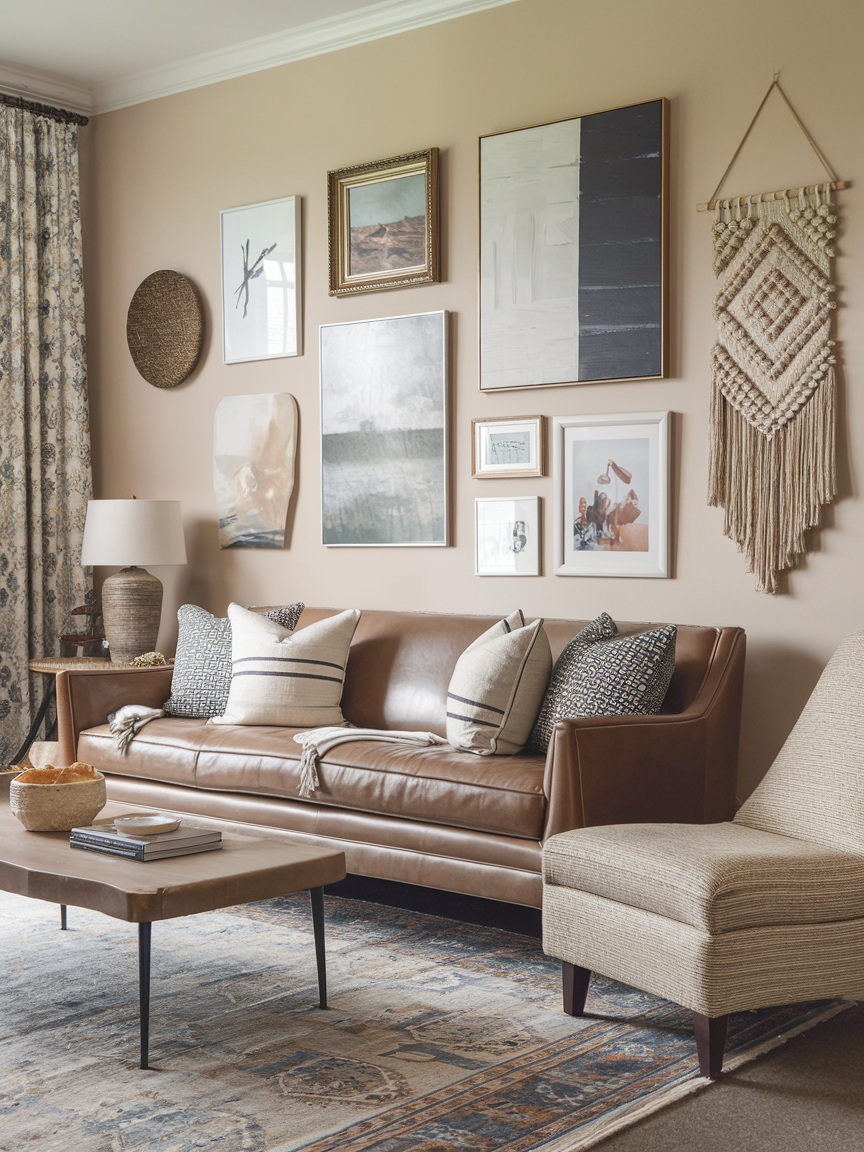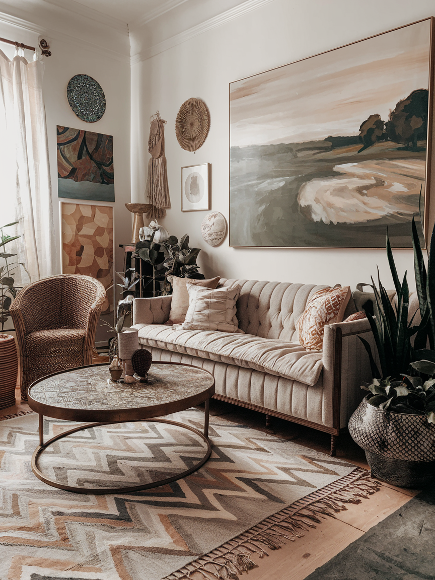 A Bohemian gallery wall is not about perfect symmetry or matching frames. It is about layering art, photographs, textiles, and even small objects in a way that feels personal and alive. You can mix vintage paintings with modern prints, black-and-white family photos with colorful abstract pieces, and maybe even a woven wall hanging in between. The beauty of this approach is that it grows with you. You can keep adding to it over time, so your living room tells a visual story of your life, passions, and travels.