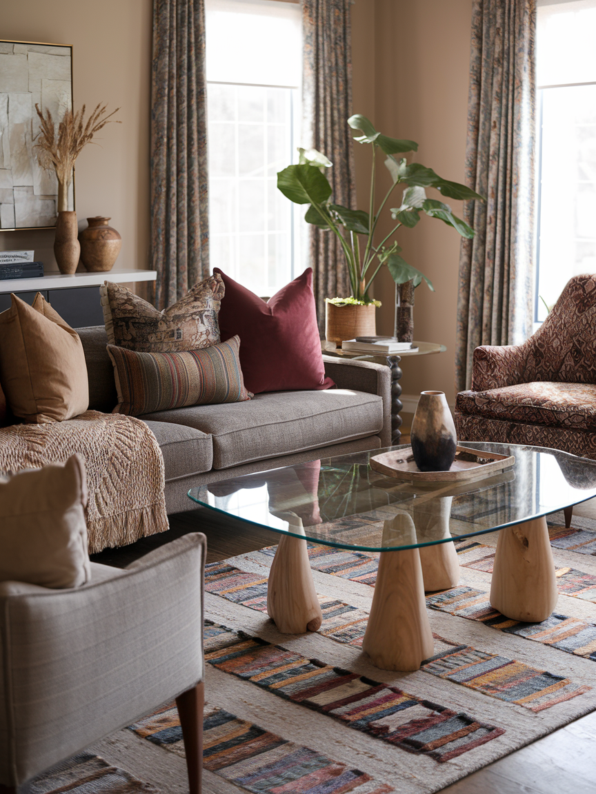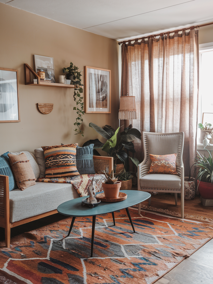Bohemian style is all about personality, so do not be afraid to add something unexpected. It could be a quirky sculpture, a vintage mirror in a bold shape, or a piece of art that makes people smile. These whimsical elements keep your space from feeling too serious and remind everyone that your living room is meant to be enjoyed, not just admired.