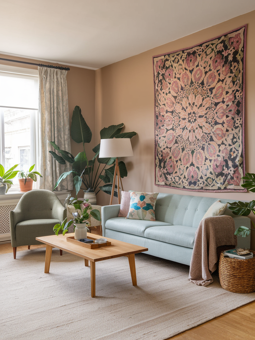 One of the easiest ways to make a Bohemian living room feel warm and inviting is to hang a large textile on the wall. It could be a colorful tapestry, a handwoven rug, or even a vintage quilt. These pieces instantly soften the space and add visual interest without needing a complicated gallery wall. They also bring in texture and color while making the room feel more grounded and intimate.