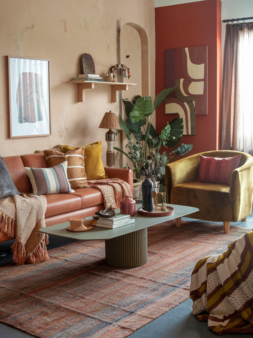 Bohemian living rooms often feature a base of warm, earthy tones, think terracotta, mustard, olive green, and deep rust, layered with pops of jewel tones or softer neutrals. This palette instantly makes the room feel grounded and inviting. You can introduce these colors through paint, textiles, art, or even small accents like candles and pottery. The goal is to create a harmonious yet vibrant environment that feels both cozy and alive.