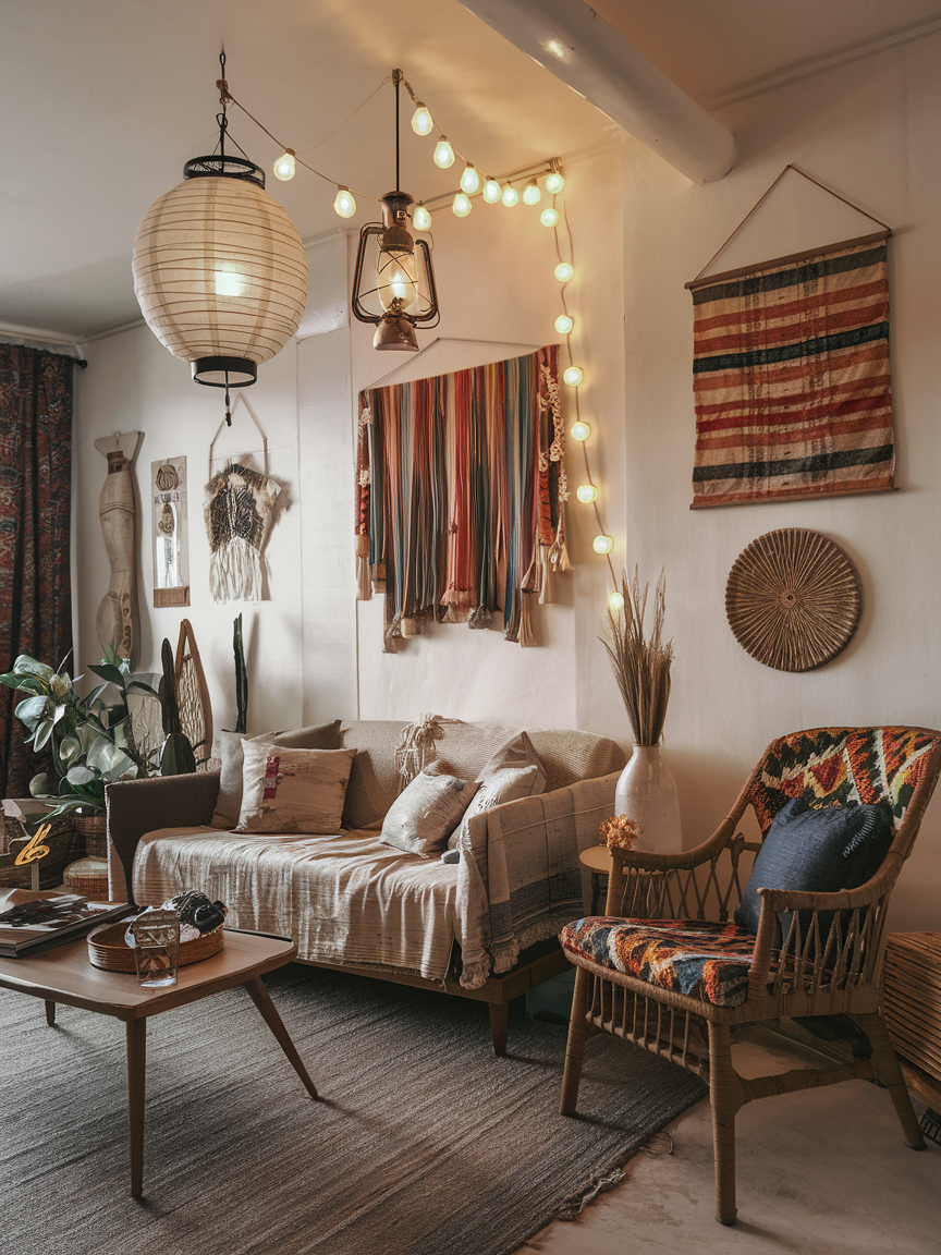 For that magical, slightly whimsical glow, add lanterns and string lights to your Bohemian living room. Lanterns, especially those with intricate cutouts, cast beautiful shadows that create a relaxing atmosphere. String lights can be draped along a wall, around a window, or even across the ceiling for a soft, dreamy vibe. These lighting choices are inexpensive yet incredibly effective in making your space feel warm and inviting.