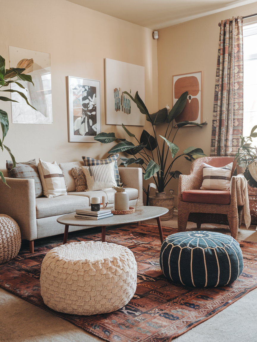 Bohemian spaces are all about relaxation, and nothing says “kick off your shoes” like low seating. Think floor cushions, poufs, or a low-profile sofa. These seating options make the room feel more intimate and grounded, encouraging people to relax and linger. You can mix colors and fabrics to make it even more eclectic. Plus, they are surprisingly versatile—you can move them around for movie night, extra guests, or even a cozy reading spot by the window.