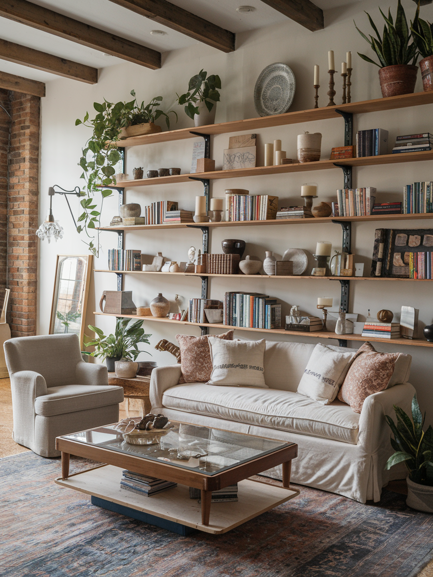 If you have collections—ceramics, candles, travel souvenirs—open shelving is the perfect way to display them. In a Bohemian living room, these shelves are not meant to be perfectly organized; they are meant to look curated yet relaxed. Mix books with objects, add plants for freshness, and do not be afraid to leave a little negative space so the eye has room to rest.