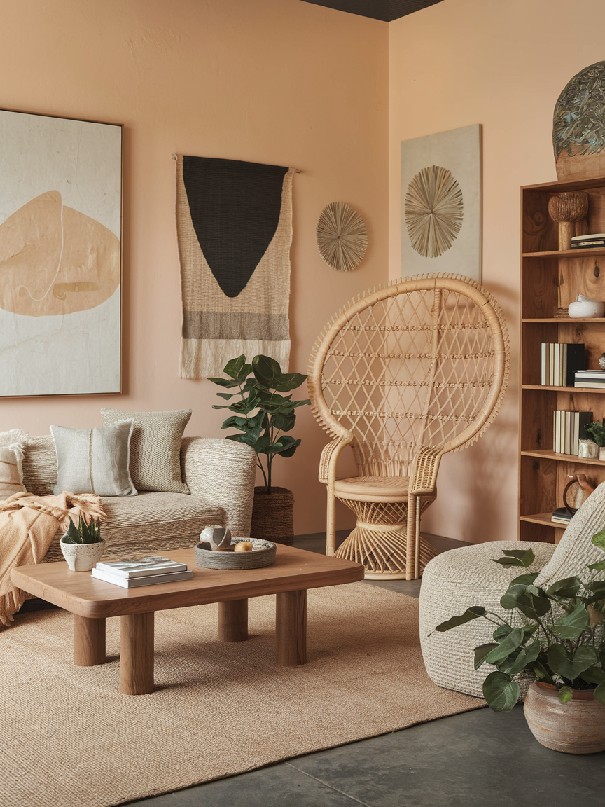 Every Bohemian living room needs a piece that says, “sit here and read for hours.” A rattan chair, especially one with a unique silhouette like a peacock back, instantly adds texture and a touch of tropical energy to your space. Pair it with a big, comfy cushion and maybe a throw blanket, and you have a corner that practically begs for coffee and conversation. Rattan also plays beautifully with plants and warm wood tones, making it a go-to choice for that breezy Boho look.
