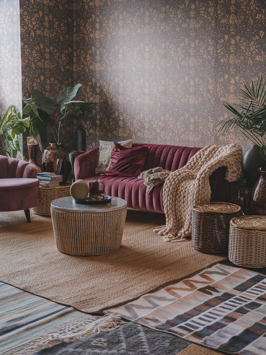 If Bohemian style had a rule, it would be “more texture, more soul.” Mix soft blankets with chunky knit throws, pair a velvet sofa with a jute rug, and add wicker baskets next to a glossy ceramic vase. Playing with different textures makes the space feel rich and lived-in. This is one of those design choices that people might not consciously notice, but they will feel it when they walk in. It is the difference between “nice room” and “I never want to leave.”