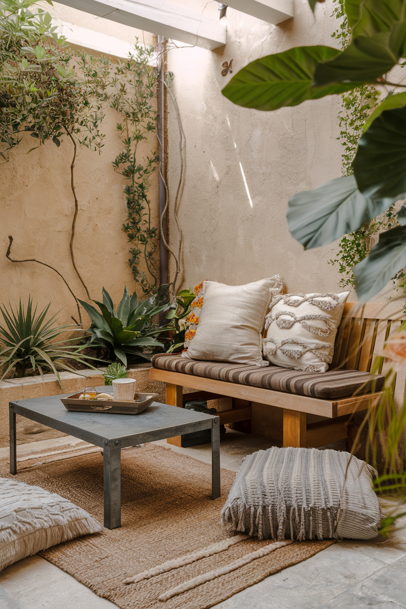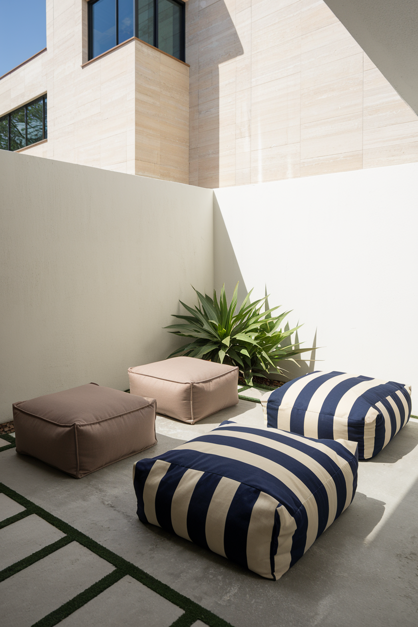 For a relaxed, informal seating arrangement, opt for weatherproof poufs and oversized floor cushions. These are great for small patios as they provide flexible seating without the bulk of traditional chairs. Stack them when not in use or spread them out for casual gatherings. Choose durable, outdoor-friendly fabrics that resist moisture and fading, ensuring long-lasting comfort and style. Mixing colors and patterns can add a playful, inviting touch to your outdoor lounge area.