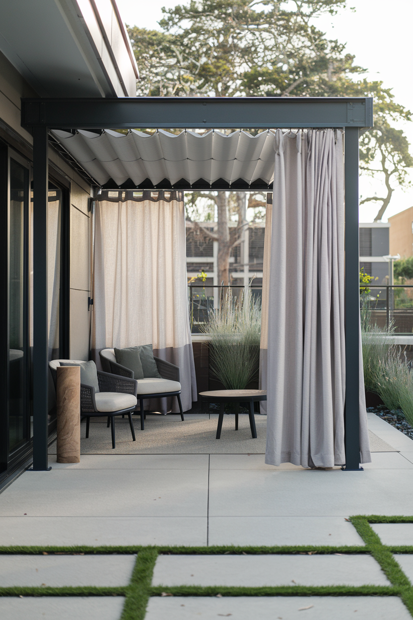 If your patio feels too exposed, sheer or weather-resistant outdoor curtains can add an element of privacy while enhancing the aesthetic appeal. Flowing curtains create a soft, breezy feel and can be drawn closed for a cozy, intimate setting. Choose light, neutral colors to keep the space feeling open, or opt for bold prints to make a design statement. Hanging curtains from a pergola or a simple rod-mounted frame can instantly elevate the look and functionality of your small patio.