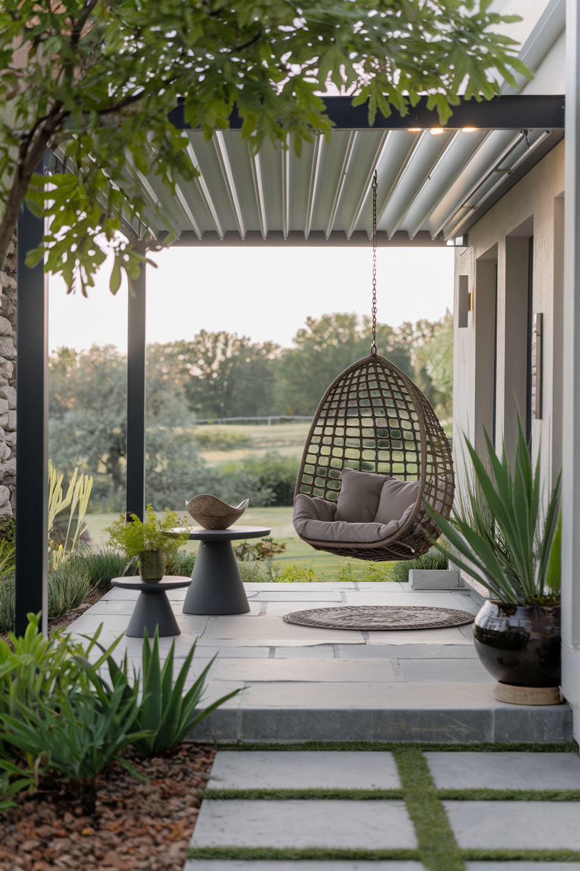 Introduce a playful yet relaxing element to your patio with a hanging swing or hammock chair. These space-saving seating options provide a cozy spot to unwind while adding a bohemian or modern touch to your outdoor décor. A macrame hammock chair suspended from a sturdy beam or ceiling hook can create a dreamy corner for reading or lounging. For an urban chic vibe, a sleek hanging egg chair with plush cushions offers both comfort and style without taking up too much ground space.