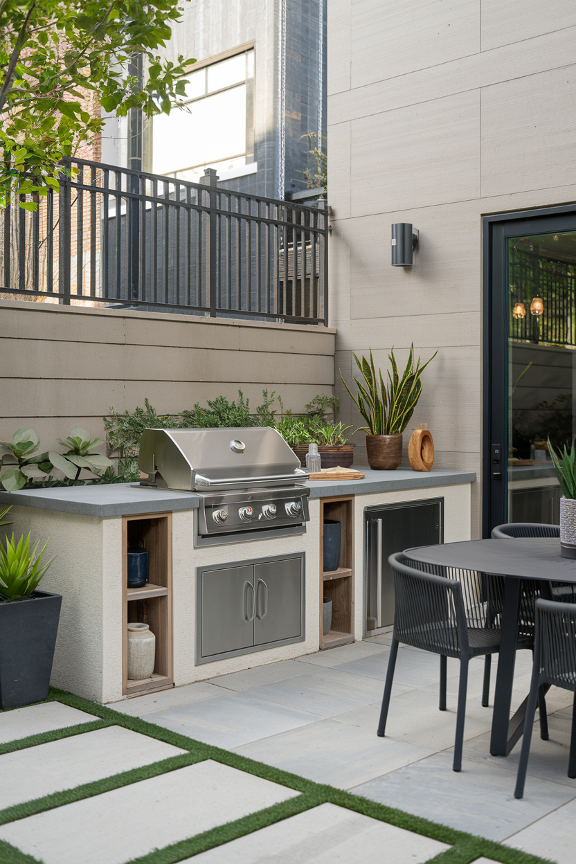 If you enjoy cooking outdoors, consider incorporating a compact outdoor kitchen or a small grilling station. A simple setup with a portable grill, a prep counter, and some storage shelves can transform your patio into a functional outdoor cooking space. If space allows, a built-in grilling island with storage compartments keeps utensils and ingredients within easy reach. Pair the setup with a small dining nook, and you have an all-in-one entertainment hub perfect for alfresco meals.