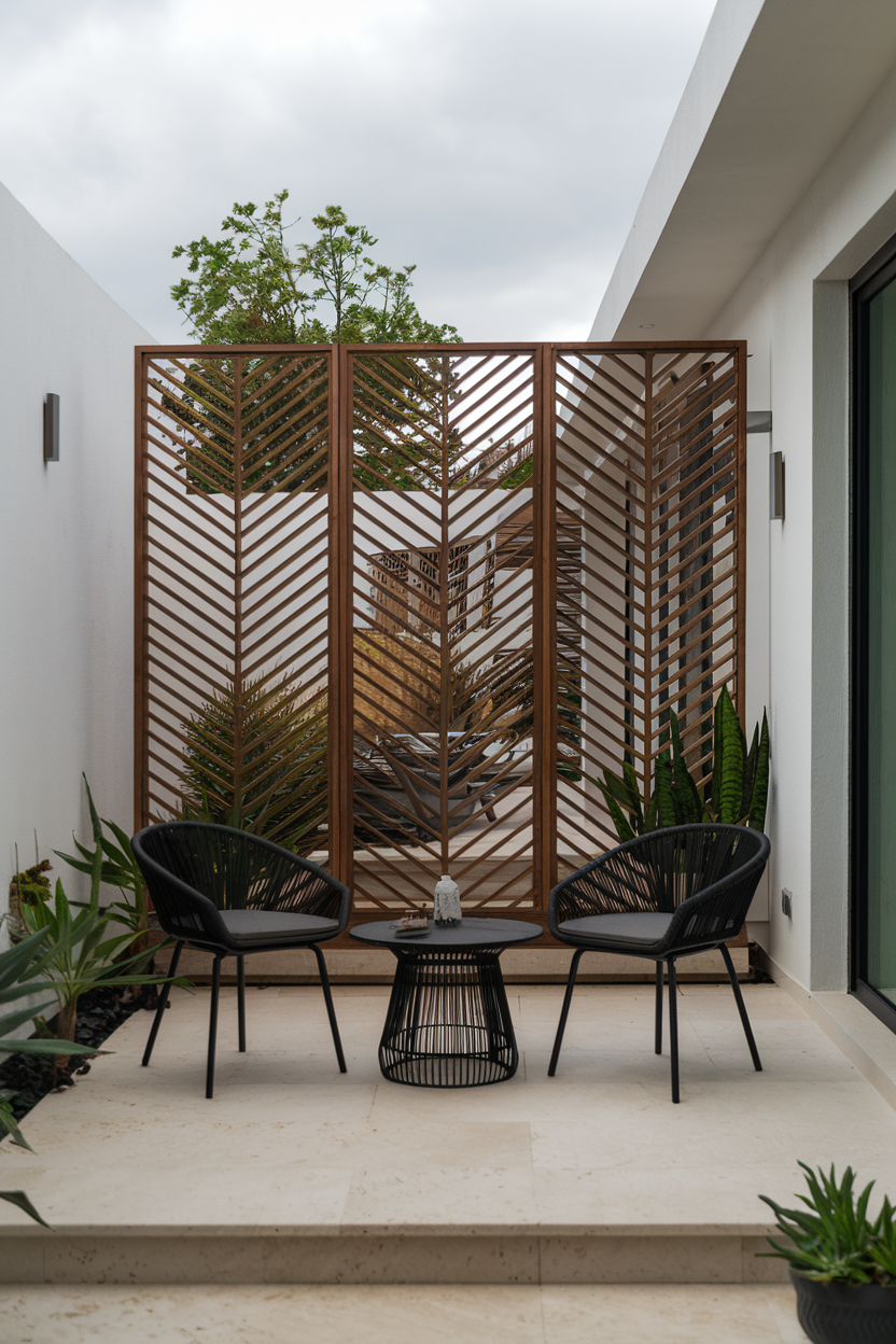 A decorative privacy screen can add both functionality and aesthetic appeal to a small patio. Whether made of lattice, wood, metal, or bamboo, these screens help block unwanted views while adding a stylish element to your outdoor space. Consider planting climbing vines or hanging fairy lights on the screen for added charm. If you want a customizable option, modular screens allow you to adjust the layout as needed, making them a flexible solution for defining your patio’s boundaries.
