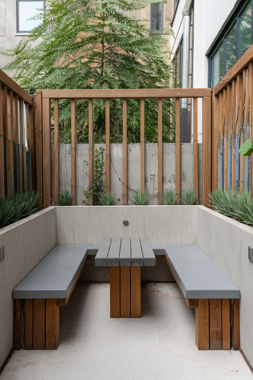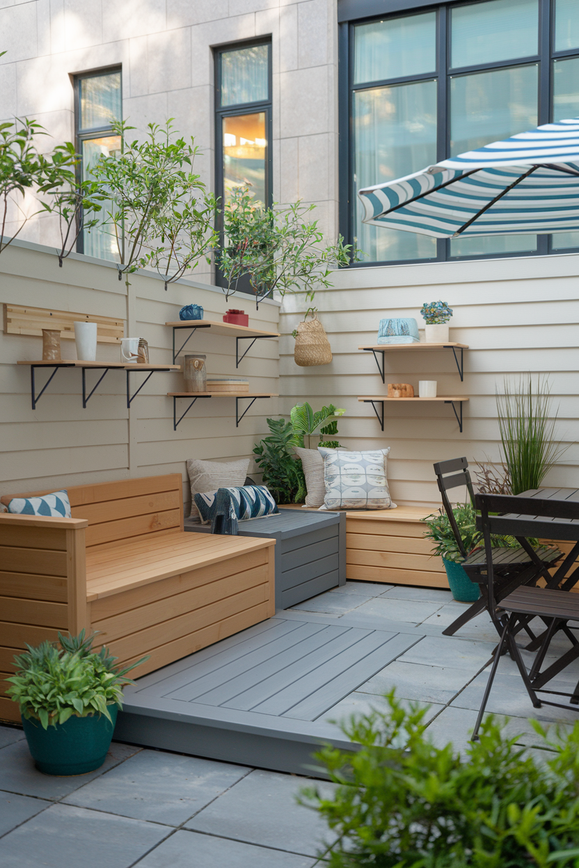 Save space by incorporating built-in benches along the walls or corners of your patio. This design choice eliminates the need for bulky chairs while providing ample seating for guests. Add plush cushions and throw pillows to enhance comfort and create a stylish, inviting look. Built-in seating can also feature hidden storage compartments for stashing away outdoor essentials like cushions, gardening tools, or decorative accessories. Consider using wood or concrete for a sleek and durable finish.
