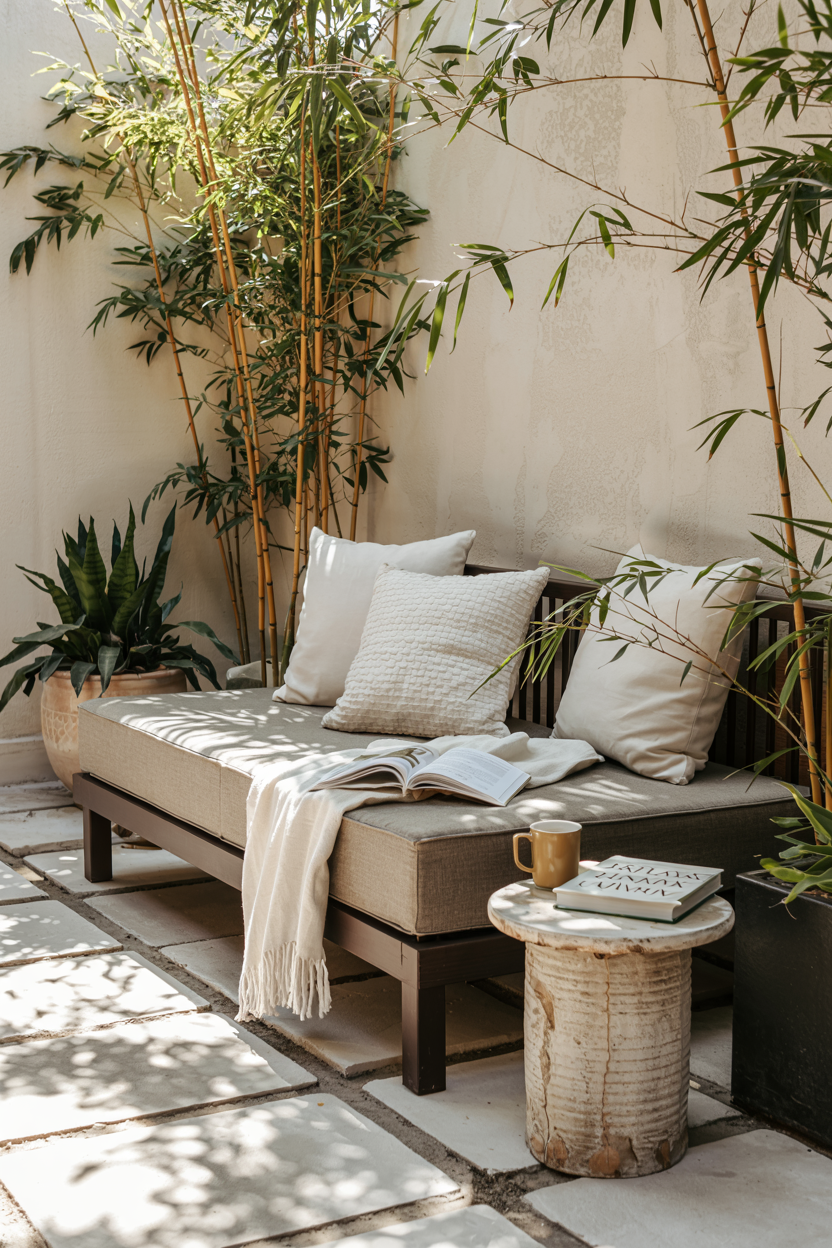 A small patio can still be a luxurious lounging spot with the addition of a compact outdoor daybed. Choose a space-saving design like a bench-style daybed with hidden storage, or opt for a hanging daybed for a chic, floating effect. Add soft cushions and a throw blanket to make it the perfect relaxation spot for reading, napping, or enjoying a sunny afternoon outdoors.