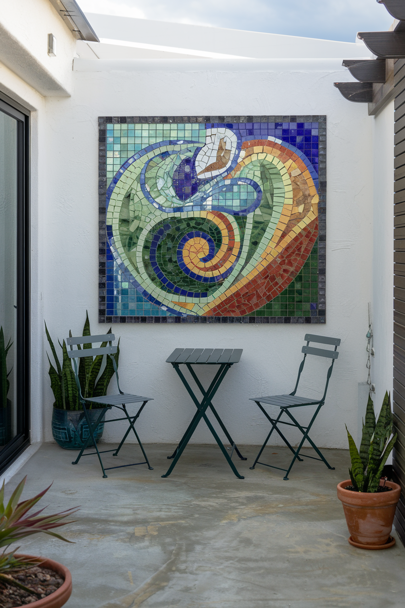 Express your style by incorporating outdoor-friendly artwork into your patio design. Weather-resistant metal sculptures, mosaic wall hangings, or framed waterproof prints can add a unique flair. Positioning artwork on a blank wall or fence creates a focal point, adding personality and charm to your outdoor retreat. For a DIY touch, consider painting a mural or using stencils to create a decorative pattern on a wall or floor.