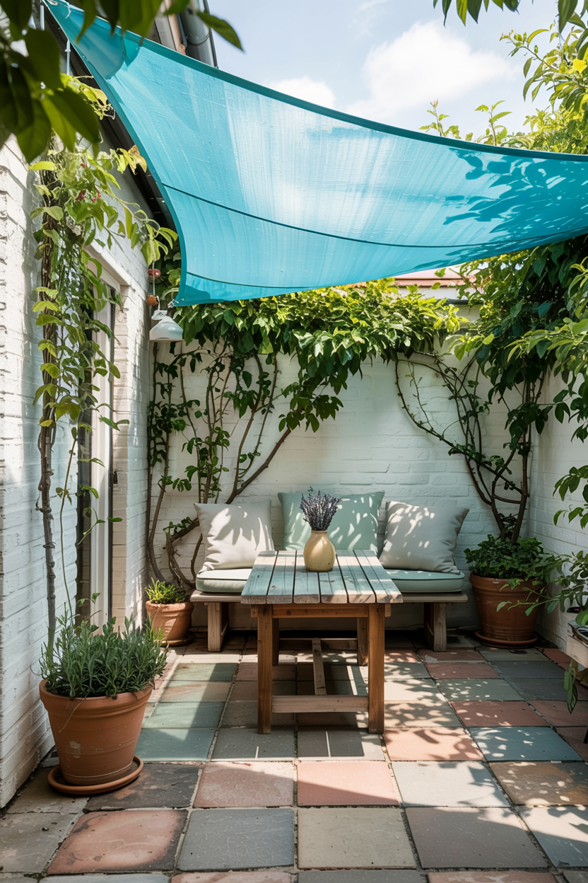 A shade sail is a modern and stylish way to provide sun protection without overwhelming a small patio. These fabric canopies come in various shapes and colors, allowing you to customize the look while keeping your space cool and comfortable. Secure the sail between sturdy poles or attach it to walls for a sleek, floating effect. This budget-friendly addition enhances both function and aesthetics, making your patio a pleasant place to relax during sunny days.