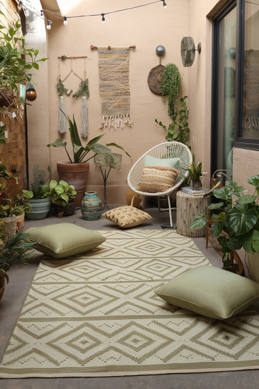 Define your patio area with a stylish outdoor rug. It not only adds warmth and texture but also helps visually expand the space, making it feel more inviting and complete. Choose a rug that complements your overall design theme, whether it’s bohemian, modern, or rustic. Weather-resistant rugs made of polypropylene or recycled plastic are durable and easy to clean. Pair the rug with matching cushions and throws to create a cozy nook perfect for lounging or entertaining guests.