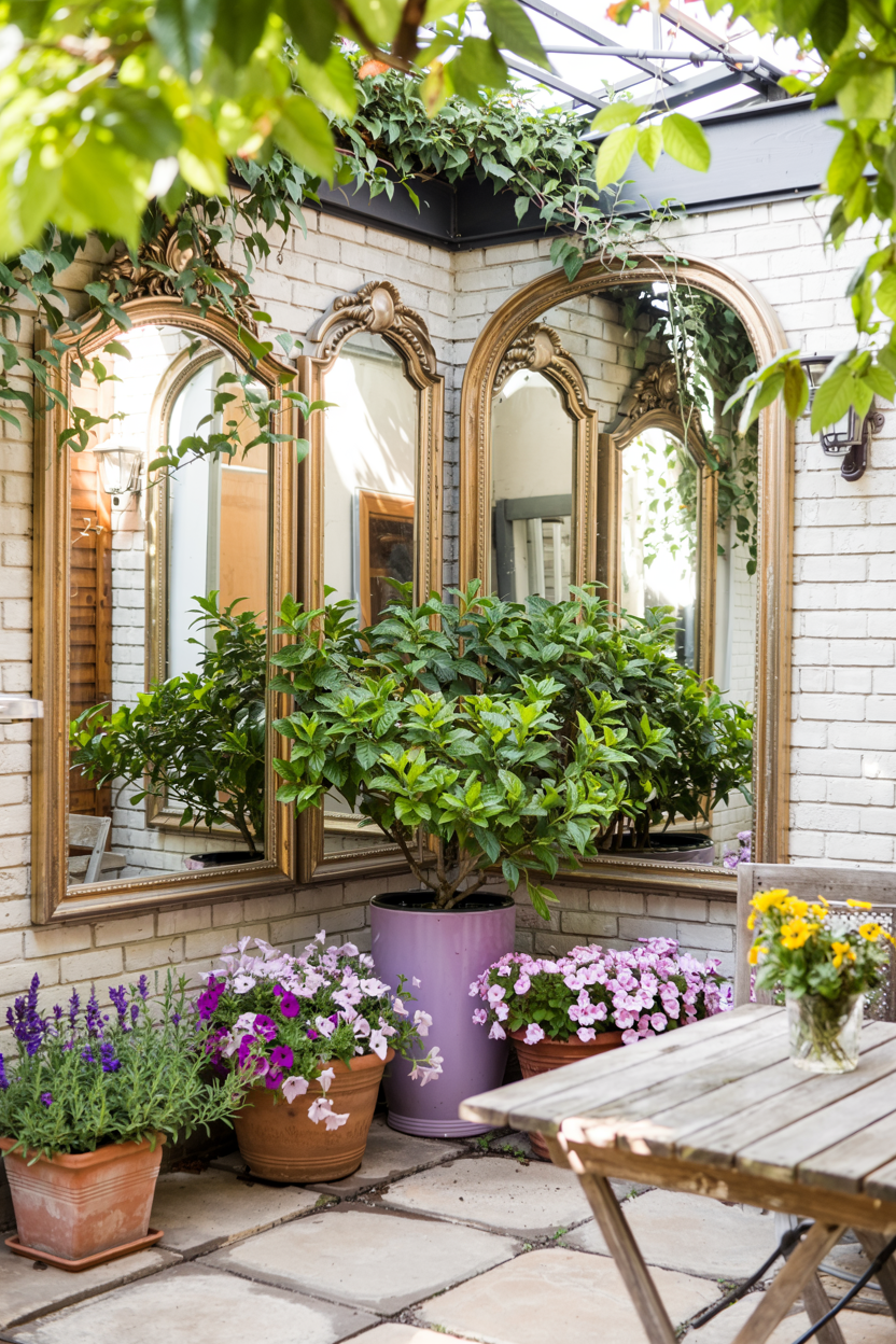 Strategically placing mirrors on walls or fences gives the illusion of a larger area by reflecting light and greenery, making the patio feel more open and airy. Choose weather-resistant mirrors with decorative frames that complement your outdoor decor. Positioning a mirror opposite a plant wall or near a light source can enhance the depth and brightness of the space, creating a visually expanded environment even in the smallest patios.