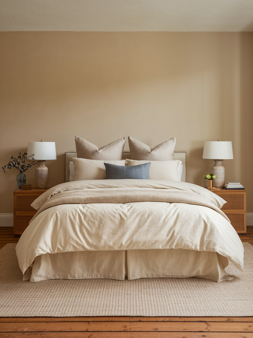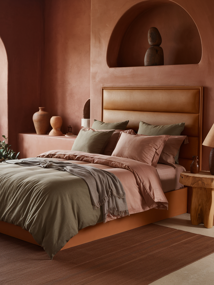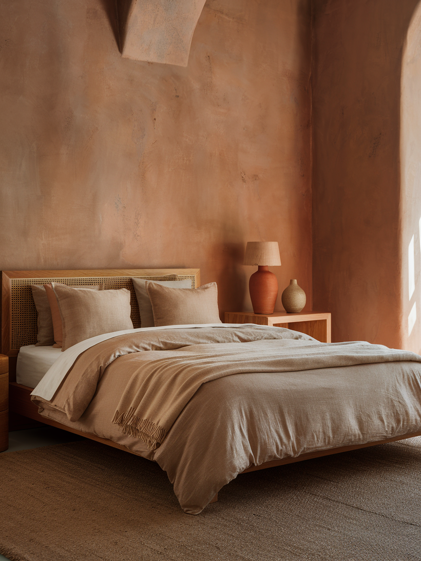 Wall color sets the emotional tone of a bedroom, and earthy shades naturally promote relaxation and warmth. Consider soft clay, muted terracotta, warm beige, sage green, or creamy mocha tones to create a grounded atmosphere. These colors wrap the room in comfort, especially when paired with warm lighting and natural textures. Unlike cool whites or stark grays, earthy tones feel nurturing and calm, helping the bedroom feel like a retreat from busy daily life. Painting all four walls in a warm hue creates a cocoon-like effect, while a single accent wall behind the bed can add depth without overwhelming the room. Complementing these tones with wooden furniture, woven textiles, and layered bedding enhances the harmonious balance between warmth and tranquility.
