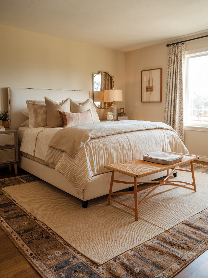 Layering area rugs instantly increases both visual warmth and physical comfort in a bedroom. Start with a large neutral base rug, such as jute or wool, to ground the space, then layer a softer patterned or plush rug on top for added texture. This technique creates depth and makes the floor feel softer underfoot, especially during cooler mornings. Rugs in warm tones like cream, caramel, muted red, or soft brown enhance the cozy atmosphere. The layered look also helps define the bed area, making the room feel intentionally styled and intimate. Beyond aesthetics, rugs absorb sound, making the bedroom quieter and more peaceful. The combination of softness, warmth, and subtle patterns contributes to a relaxing environment that encourages restful sleep.