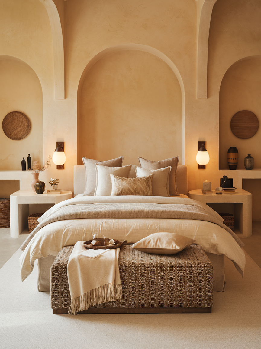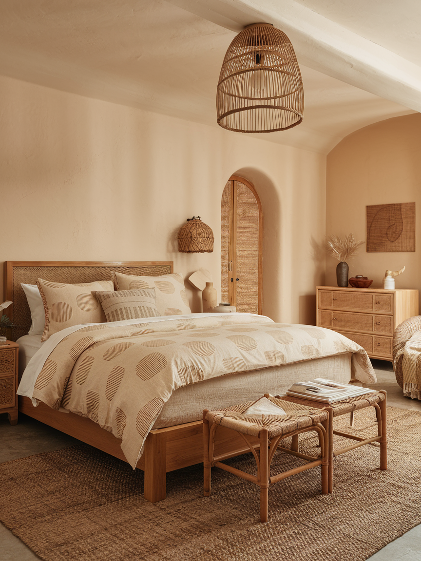 Incorporating natural fibers like rattan, jute, wicker, and seagrass introduces organic warmth into the bedroom. A woven bench at the foot of the bed, a rattan light fixture, or a jute rug enhances texture while maintaining an earthy feel. These materials balance soft fabrics and upholstered furniture by adding structure and visual contrast. Their subtle, neutral tones blend seamlessly into warm palettes without overpowering the room. Natural fibers also evoke a connection to nature, which promotes a sense of calm and grounding. When paired with warm lighting and layered bedding, these elements contribute to a serene and inviting environment that feels both stylish and comfortable.