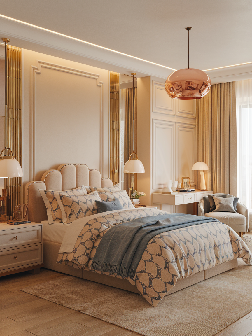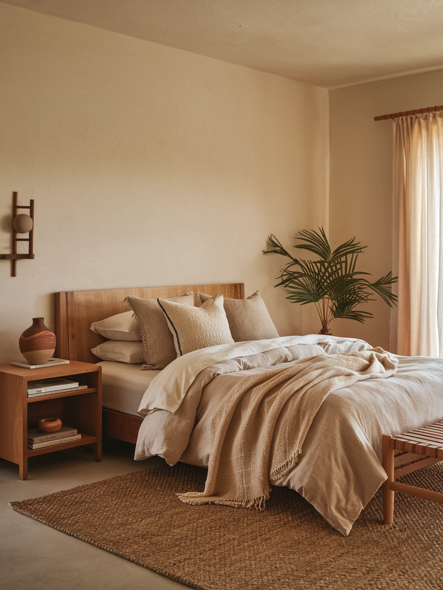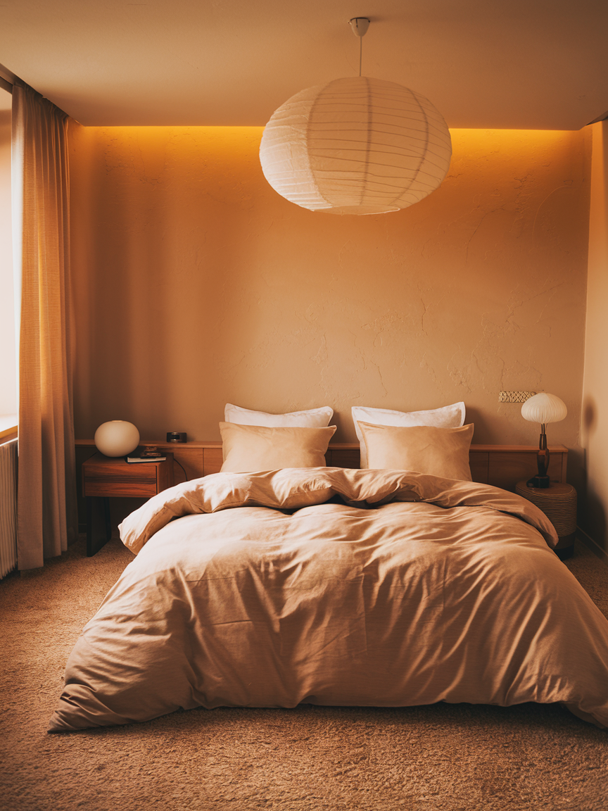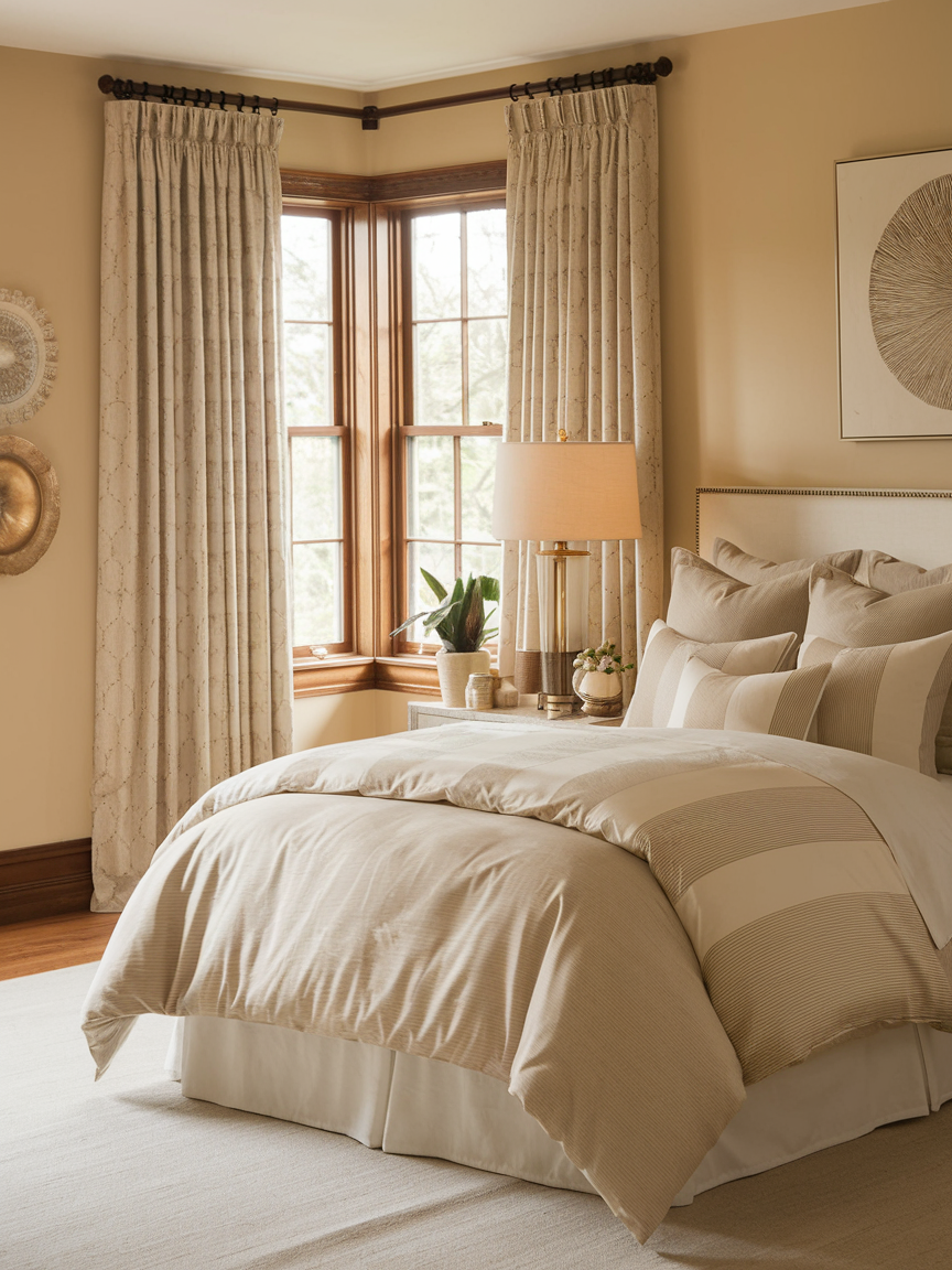 Curtains play an important role in shaping a bedroom’s mood. Sheer or lightly textured curtains in warm white, beige, or soft taupe allow natural light to filter in gently, creating a glowing ambiance throughout the day. At night, heavier layered drapes can provide privacy and insulation while adding depth to the design. Floor-length curtains make ceilings appear taller and add elegance without sacrificing comfort. Fabrics such as linen or cotton maintain breathability while contributing to the soft, relaxed feel of the space. The way natural light diffuses through warm-toned curtains enhances the cozy atmosphere, making mornings feel calm and evenings feel intimate. Thoughtful window treatments transform the bedroom into a serene retreat filled with soft light and subtle movement.