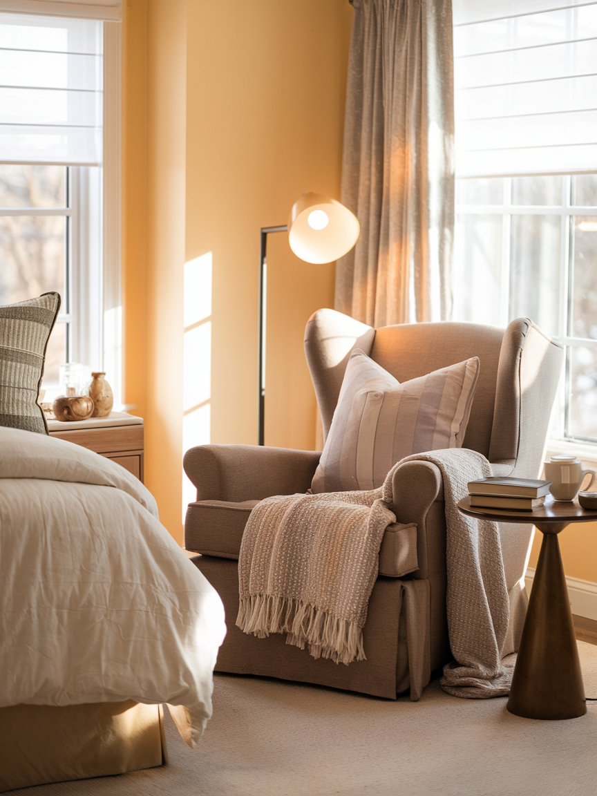Creating a small reading nook inside the bedroom enhances both functionality and warmth. A comfortable armchair upholstered in soft fabric, paired with a textured throw blanket and a supportive cushion, encourages quiet relaxation. Positioning the chair near a window allows natural light to brighten the space during the day, while a warm floor lamp provides soft illumination at night. Adding a small wooden side table for books and tea completes the cozy setup. This dedicated corner fosters moments of mindfulness and calm, transforming the bedroom into more than just a sleeping area. The presence of a reading nook reinforces the idea that the bedroom is a sanctuary designed for comfort, reflection, and gentle daily rituals.