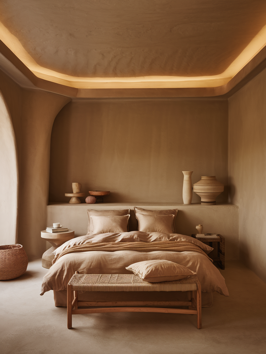 Painting the ceiling in a soft neutral shade slightly warmer than white can create a subtle cocoon effect. This technique wraps the room in warmth without making it feel dark. The seamless color transition enhances intimacy and complements layered lighting. Combined with earthy walls and wooden furniture, the ceiling contributes to a unified and harmonious atmosphere.