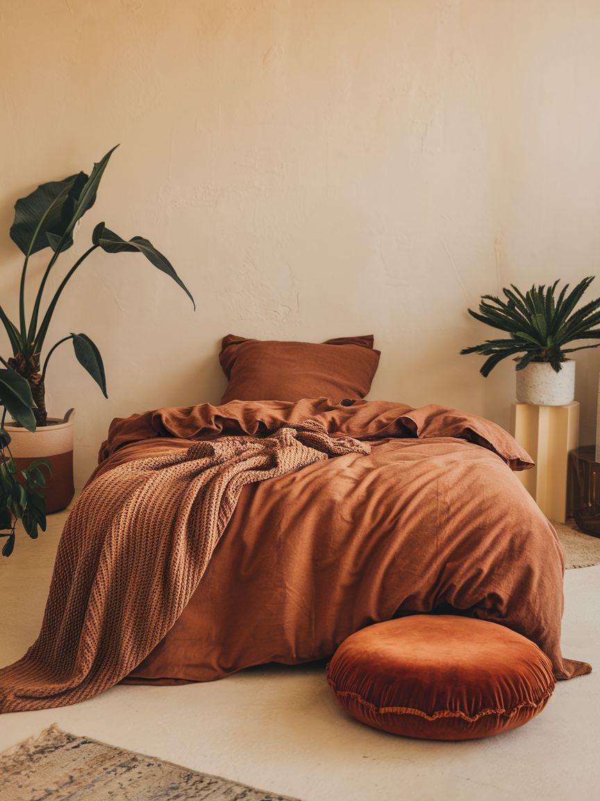 Layering bedding in warm tones builds both visual richness and physical comfort. Start with soft cotton or linen sheets in creamy white or beige, then add a quilt or duvet in earthy shades like rust, mocha, or muted blush. Incorporating multiple textures, such as knit blankets, velvet cushions, or waffle-weave throws, adds dimension while keeping the palette cohesive. This layered approach makes the bed look plush and inviting, encouraging relaxation the moment you enter the room. Mixing subtle patterns with solid colors can add personality without overwhelming the calming aesthetic. The combination of softness, warmth, and thoughtful styling transforms the bed into the focal point of the bedroom, reinforcing its purpose as a place for rest and rejuvenation.