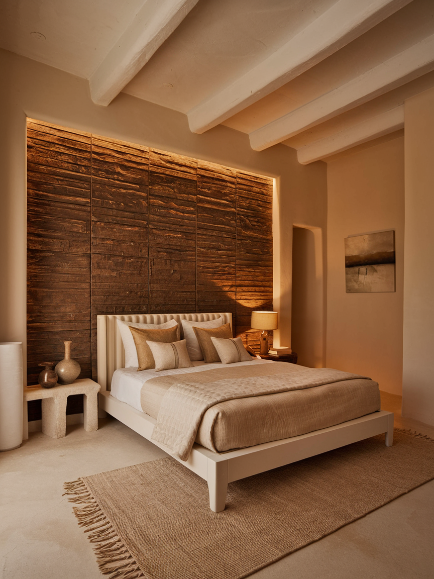 A textured accent wall can dramatically enhance the warmth of a bedroom without relying on bold colors. Options like wood paneling, limewash paint, subtle wallpaper, or fabric wall coverings add depth and character while maintaining a soothing palette. Warm neutrals or earthy shades work best to preserve the relaxing atmosphere. Placing texture behind the bed creates a striking focal point that feels intentional and cozy rather than overwhelming. The added dimension makes the room feel layered and thoughtfully designed. Pairing the accent wall with soft lighting and complementary bedding enhances its impact. This subtle design feature brings personality into the bedroom while maintaining the calm, inviting mood essential for a restful retreat.