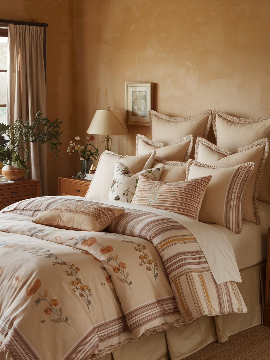 Decorative pillows contribute both comfort and visual warmth to a bedroom. Choosing covers in velvet, chenille, linen, or knit fabrics enhances texture and softness. Warm hues such as terracotta, caramel, mustard, or soft cream help create a cohesive and inviting palette. Mixing different sizes and shapes adds interest while maintaining balance. Layering pillows against an upholstered headboard amplifies the plush, welcoming look of the bed. Beyond aesthetics, additional pillows provide functional comfort for reading or lounging. The tactile appeal of soft fabrics encourages relaxation, making the bedroom feel nurturing and thoughtfully curated. With careful coordination of colors and textures, decorative pillows elevate the space while preserving a calm and harmonious atmosphere.