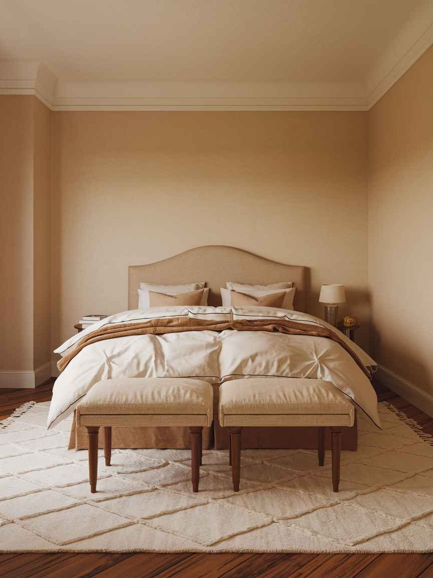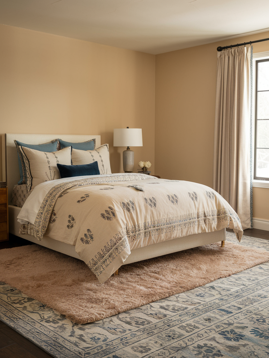 A soft area rug instantly adds warmth and comfort, especially during cooler mornings. Choose plush textures like wool, shag, or thick woven materials in neutral or warm shades. Position the rug so it extends beyond the bed, allowing your feet to land on softness instead of cold flooring. Layering a patterned rug over a larger neutral base can also add dimension. Rugs not only provide physical warmth but also visually anchor the room, making it feel complete and cozy.