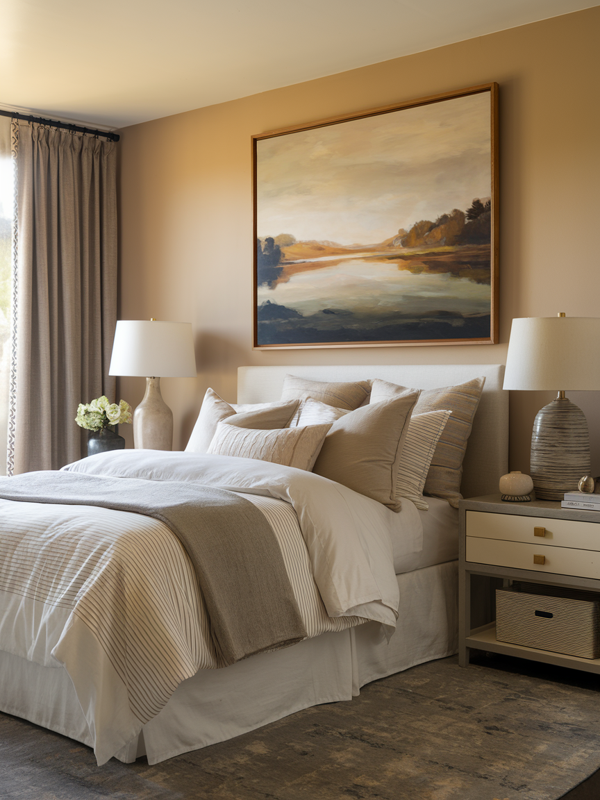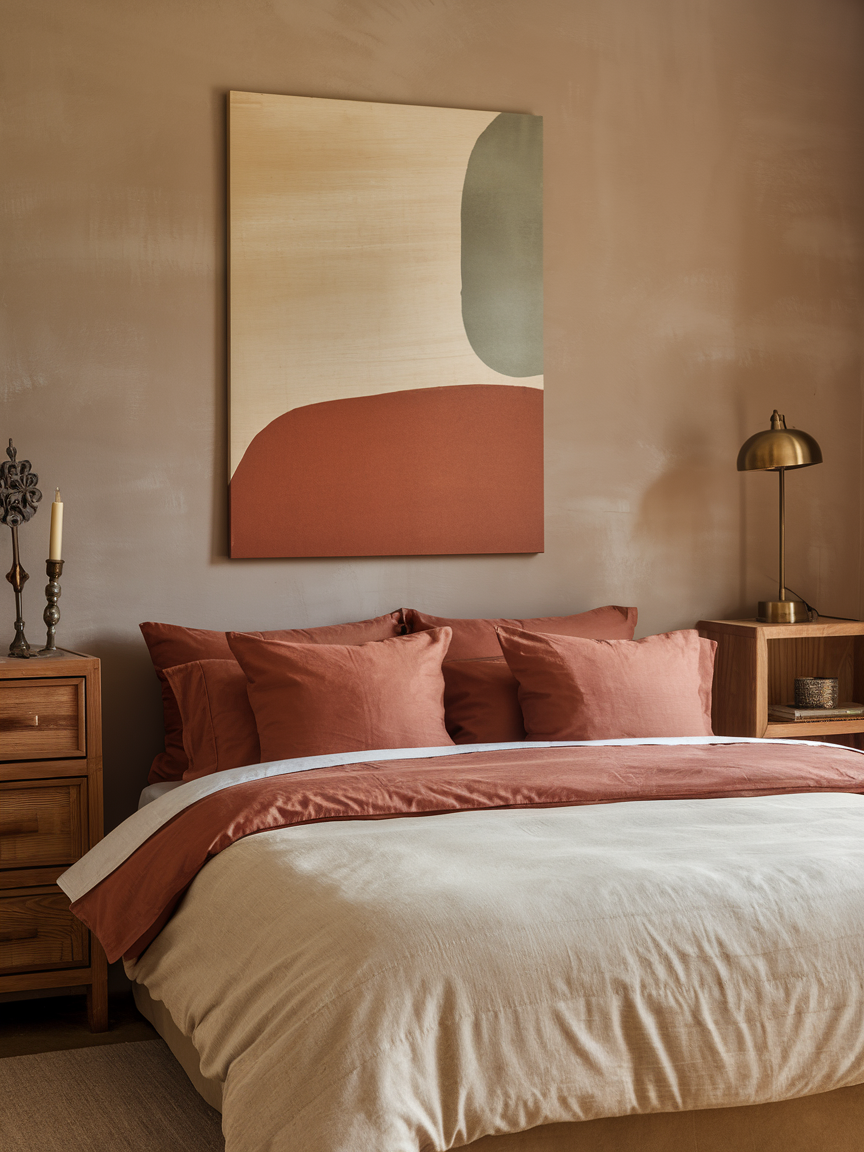 Artwork in earthy hues like beige, rust, muted green, or warm gray enhances the bedroom’s comforting atmosphere. Abstract pieces, landscape prints, or textured canvases add personality while maintaining harmony. Positioning art above the bed or dresser creates a focal point that ties the room together. Choosing wooden or brass frames further complements the warm aesthetic. Art that reflects calming themes, such as nature or gentle patterns, reinforces the relaxing mood. This subtle decorative layer personalizes the bedroom without disrupting its peaceful ambiance.