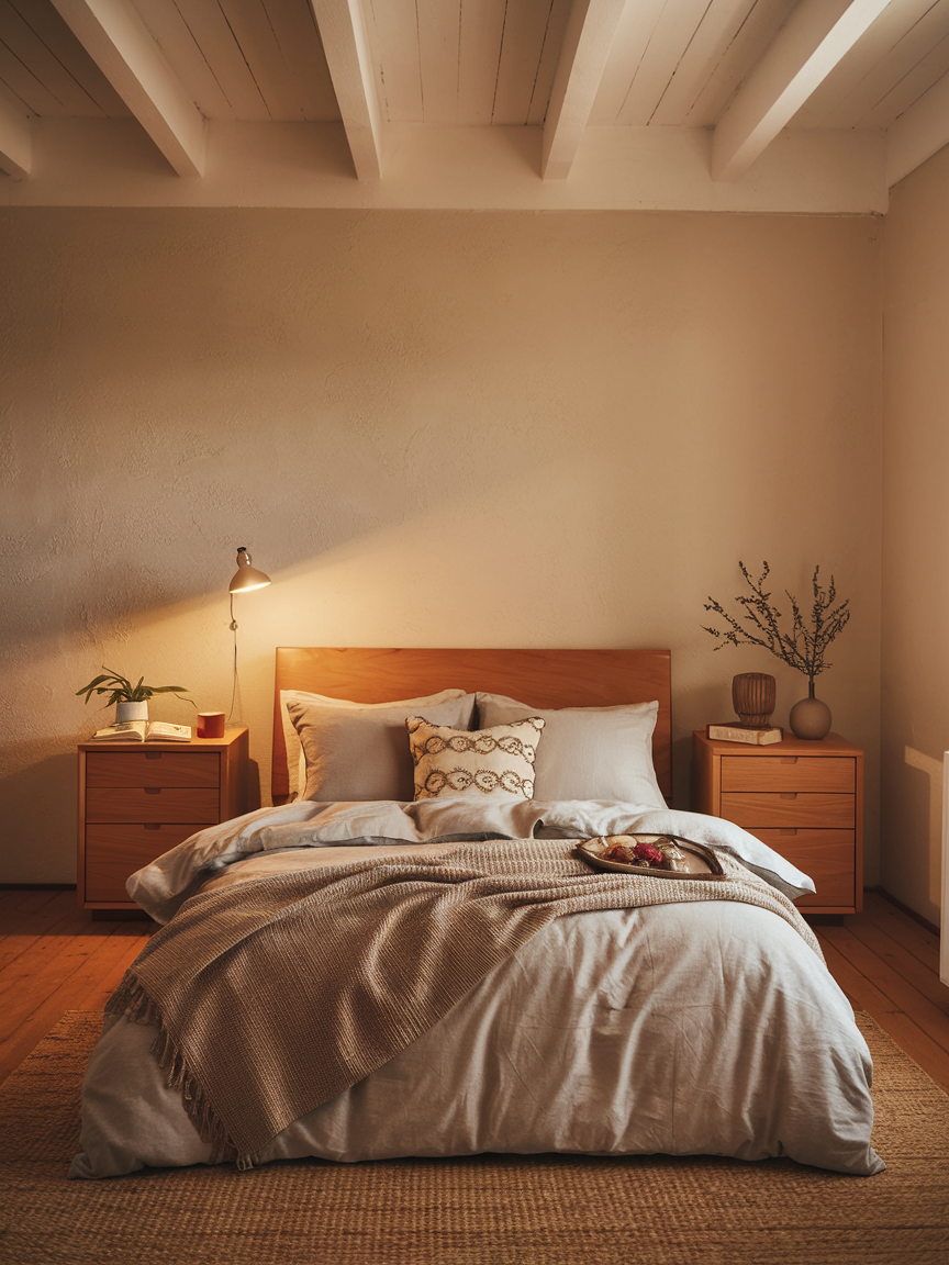 Lighting plays a powerful role in creating a cozy and warm bedroom that feels deeply relaxing at the end of a long day. Instead of relying on harsh overhead lighting, layer your space with soft ambient sources such as bedside lamps, wall sconces, and subtle floor lamps. Choosing warm-toned bulbs (around 2700K) instantly creates a golden glow that makes the entire room feel comforting and intimate. Fabric lampshades diffuse light beautifully, preventing glare while adding texture and softness to the design. You can also incorporate dimmer switches to adjust brightness depending on your mood, whether you are reading, journaling, or preparing to sleep. The gentle illumination enhances warm color palettes and natural materials, transforming your bedroom into a peaceful sanctuary that encourages rest and emotional calm.