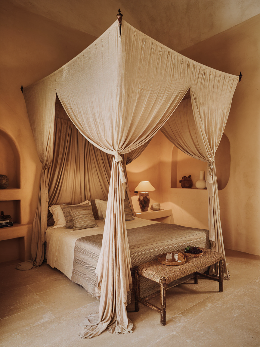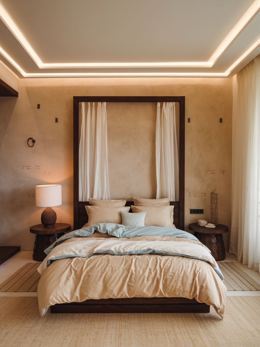 A subtle canopy above the bed introduces romance and intimacy into a cozy bedroom. Light fabrics draped softly from the ceiling create a cocoon-like effect without overwhelming the space. Sheer materials in warm white or soft beige maintain airiness while adding elegance. The canopy frames the bed as the focal point, enhancing its inviting presence. Paired with soft lighting and layered bedding, this design detail elevates comfort while maintaining a gentle and calming aesthetic.