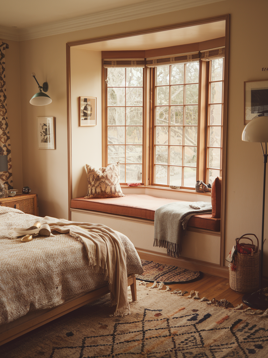 If space allows, a built-in or freestanding window seat creates an inviting relaxation corner. Soft cushions in warm fabrics and layered throws enhance comfort. Natural light during the day and gentle lamp light at night make the space versatile. This cozy nook encourages quiet moments of reflection, reading, or simply enjoying peaceful views. The added seating increases both function and warmth within the bedroom layout.