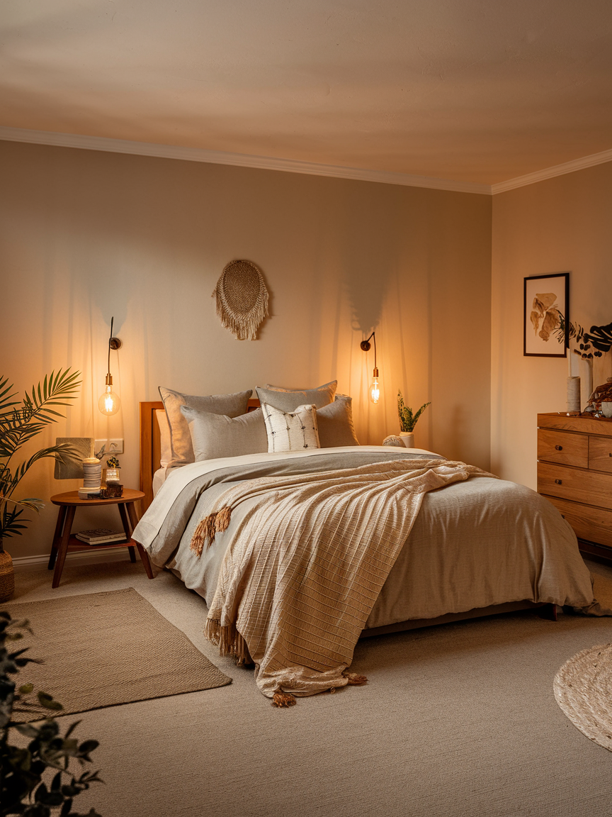 Texture and tone work together to build a truly comfortable space. Plush bedding, knitted throws, upholstered headboards, and natural wood accents add depth while maintaining a harmonious look. Soft neutrals, earthy hues, and warm lighting enhance the overall ambiance, helping the room feel intimate without appearing heavy or cluttered.