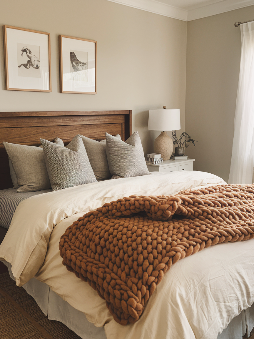 Few elements communicate warmth more clearly than a chunky knit throw draped across the bed or a cozy reading chair. The thick texture immediately adds visual depth while inviting you to curl up and relax. Neutral shades such as cream, caramel, rust, or soft gray blend beautifully into warm bedroom palettes while still standing out as comforting accents. Layering a knit blanket over crisp bedding creates contrast, making the bed look plush and inviting rather than flat. During colder evenings, the added warmth enhances physical comfort, while during warmer months, it still functions as a decorative statement piece. The tactile quality of chunky knit fabric stimulates a sense of relaxation and security, helping the bedroom feel personal, nurturing, and thoughtfully styled without appearing cluttered.
