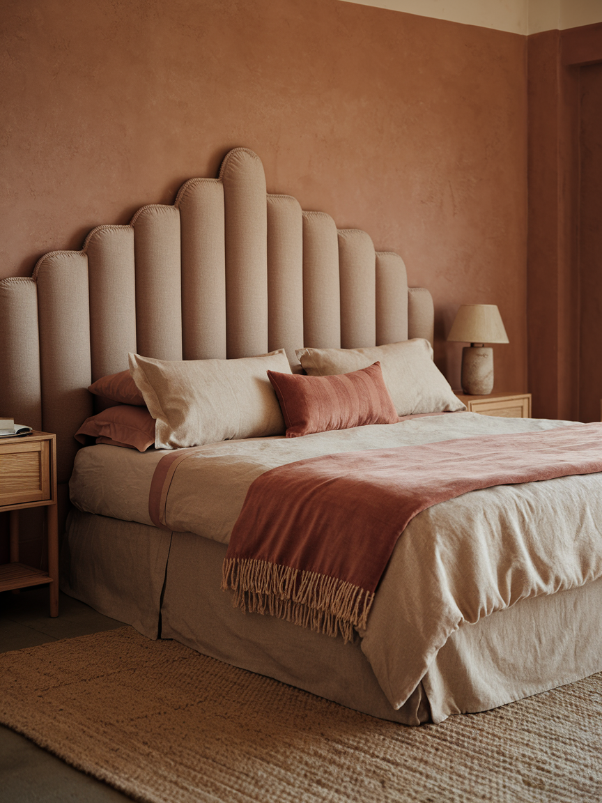 An upholstered headboard adds both visual softness and functional comfort to a cozy warm bedroom. Fabrics like linen, velvet, or soft cotton create a gentle backdrop for pillows and bedding while introducing texture. Warm hues such as beige, taupe, muted terracotta, or dusty blush reinforce the inviting atmosphere. The padded surface provides support for reading or watching television in bed, enhancing the bedroom’s comfort factor. A tall upholstered headboard can also make the space feel more intimate by visually anchoring the bed as the focal point of the room. Tufted or subtly channeled designs add elegance without overwhelming the space. This combination of softness, structure, and warmth creates a layered look that feels intentionally styled while still prioritizing relaxation and everyday comfort.