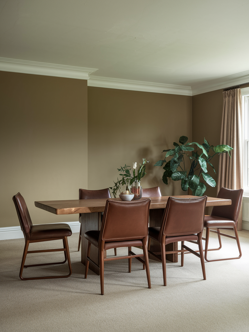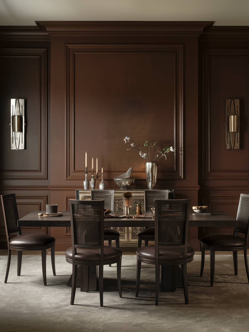 Chocolate brown walls instantly establish a sense of luxury and depth in a dining room. This deep, saturated tone creates an intimate atmosphere that feels refined rather than heavy when paired with the right elements. Lighter furniture, metallic accents, or warm wood tones help balance the darkness, preventing the room from feeling enclosed. Chocolate brown works particularly well in formal dining rooms, where elegance and mood are key priorities. Soft lighting enhances the richness of the color, adding warmth and visual softness. When styled with classic artwork or neutral upholstery, chocolate brown walls create a timeless dining space that feels sophisticated, inviting, and perfect for long, memorable meals.