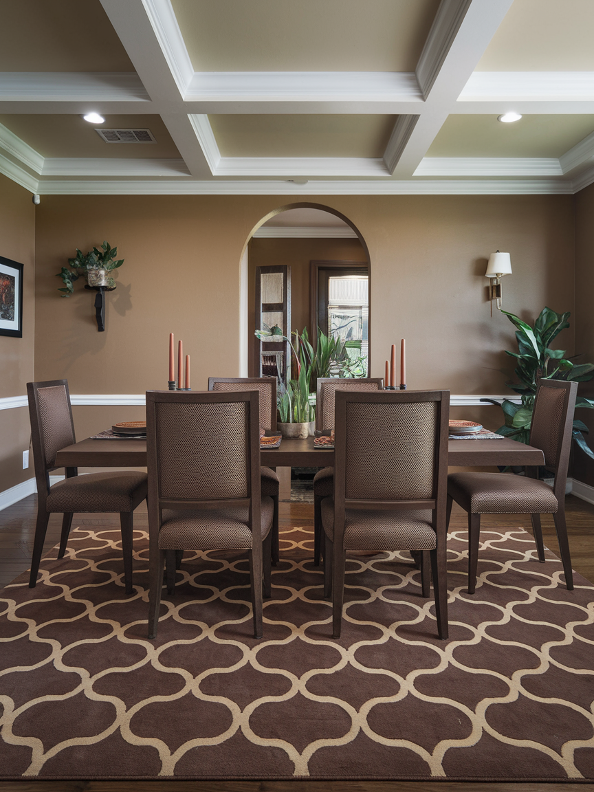 A brown area rug anchors the dining table and defines the space with warmth and texture. Rugs in chocolate, caramel, or taupe tones add comfort underfoot while protecting floors. Patterned or textured designs enhance visual interest without overwhelming the room. Brown rugs work well with both light and dark furniture, offering versatility. In open-plan layouts, a rug helps distinguish the dining area while maintaining cohesion. This design choice contributes to a cozy, elegant dining environment.