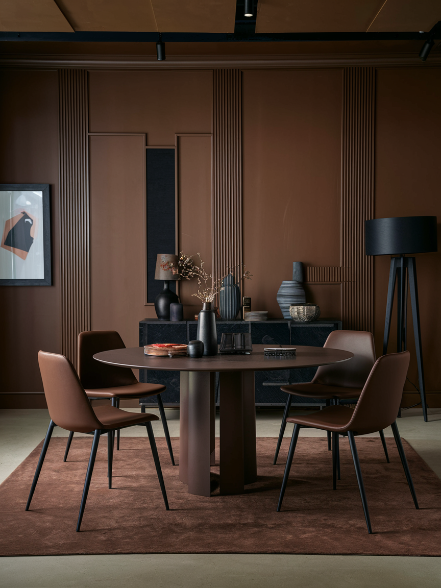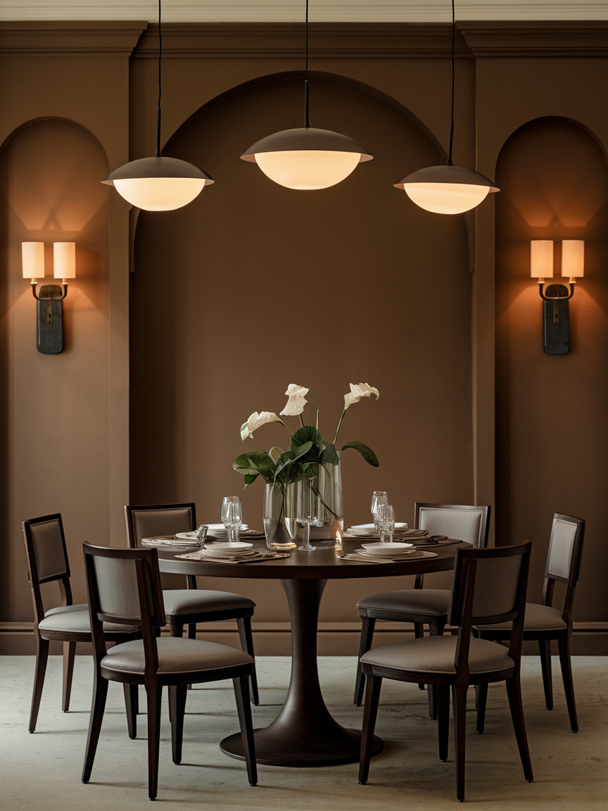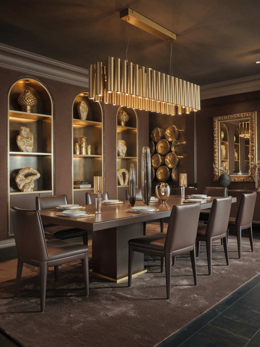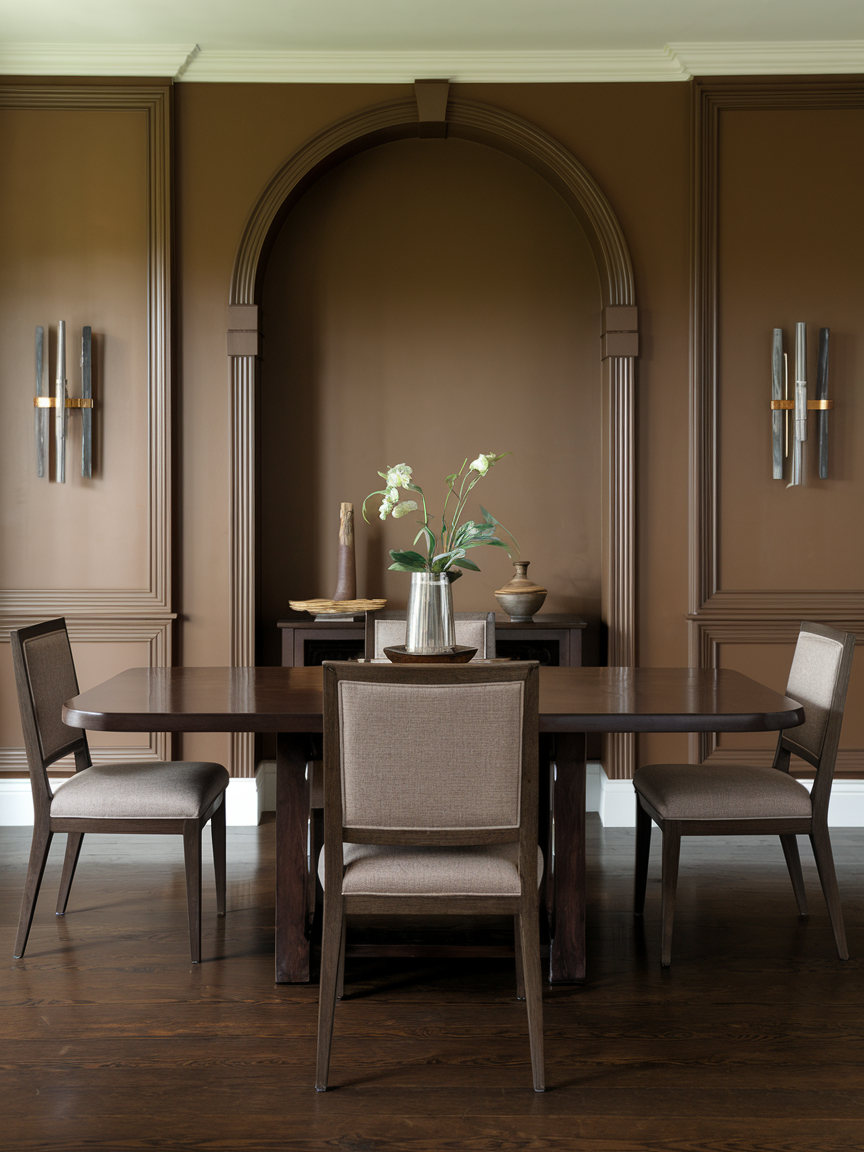 An elegant brown dining room is defined by thoughtful details and balanced textures. Natural wood tables, upholstered seating, metallic accents, and layered lighting work together to enhance the richness of the palette. Brown walls, cabinetry, or decor elements create a grounded foundation that allows statement pieces and table settings to stand out beautifully.