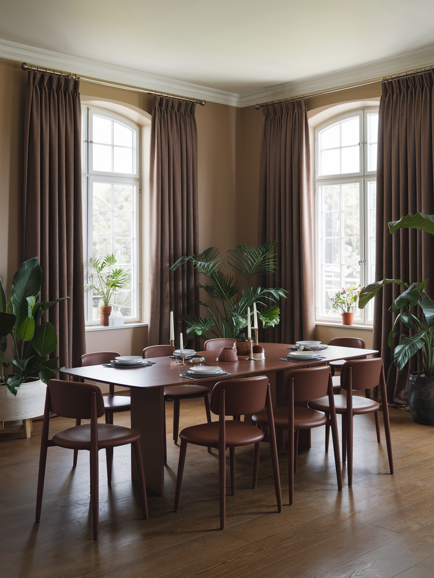 Brown curtains frame windows beautifully while adding softness and warmth to the dining room. Fabric choices such as linen, velvet, or cotton enhance texture and comfort. Brown tones complement wood furniture and neutral walls, creating cohesion. Curtains also improve acoustics, making conversations more intimate. Hung from ceiling height, they add elegance and visual height. Brown curtains are a practical yet stylish addition that elevates the dining experience.