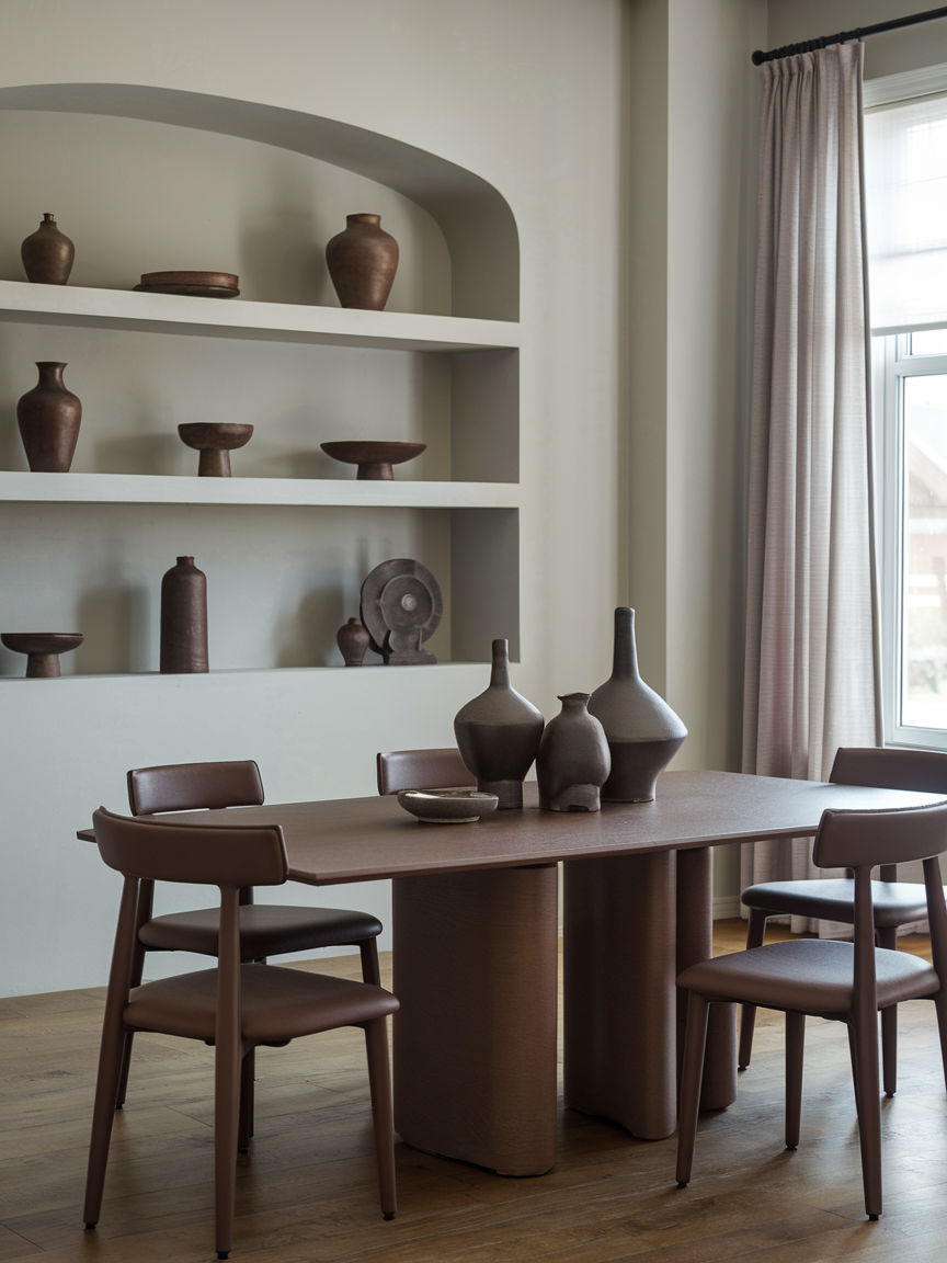 Brown ceramic decor introduces craftsmanship and texture into the dining room. Vases, bowls, or sculptural pieces add warmth and visual interest without overwhelming the space. The earthy tone of ceramics enhances a grounded, organic aesthetic. Grouped thoughtfully, these pieces create a curated look. Brown ceramics work across styles, from rustic to modern, adding subtle elegance and personality.