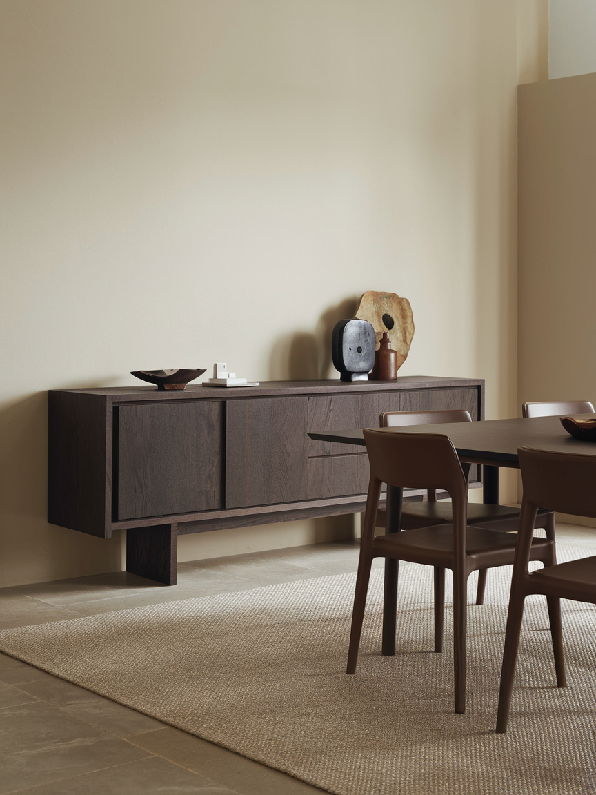 A dark wood sideboard adds storage and sophistication to the dining room. Its rich brown tone anchors the space while offering practical storage for tableware. Styled with minimal decor, a sideboard enhances elegance without clutter. Paired with neutral walls, it becomes a refined focal point. This piece combines functionality with timeless style.