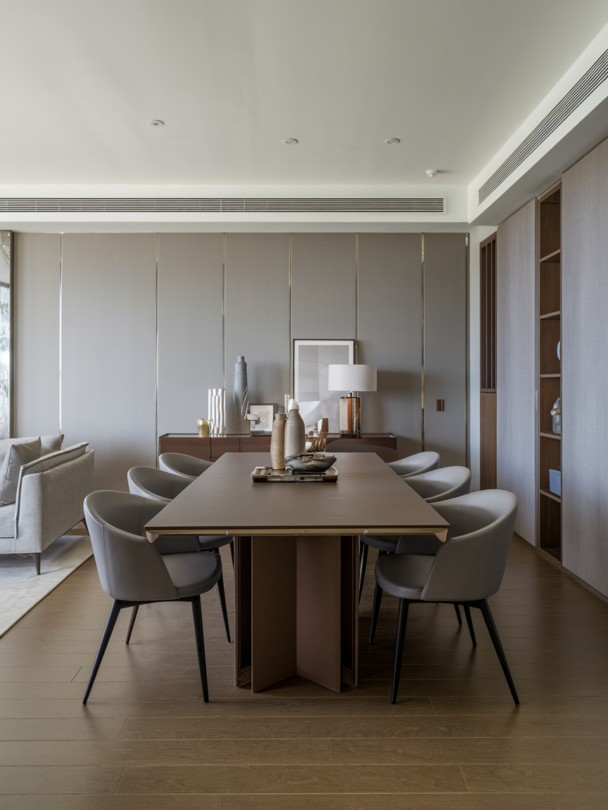 Combining brown with gray creates a contemporary yet warm dining room. Gray adds neutrality and balance, while brown contributes depth. This palette works well in modern spaces with clean lines. Textures like wood and fabric keep the room from feeling cold. The result is a sophisticated, modern dining environment.